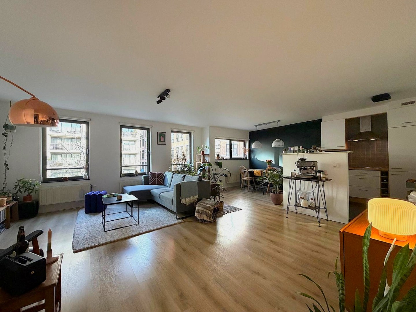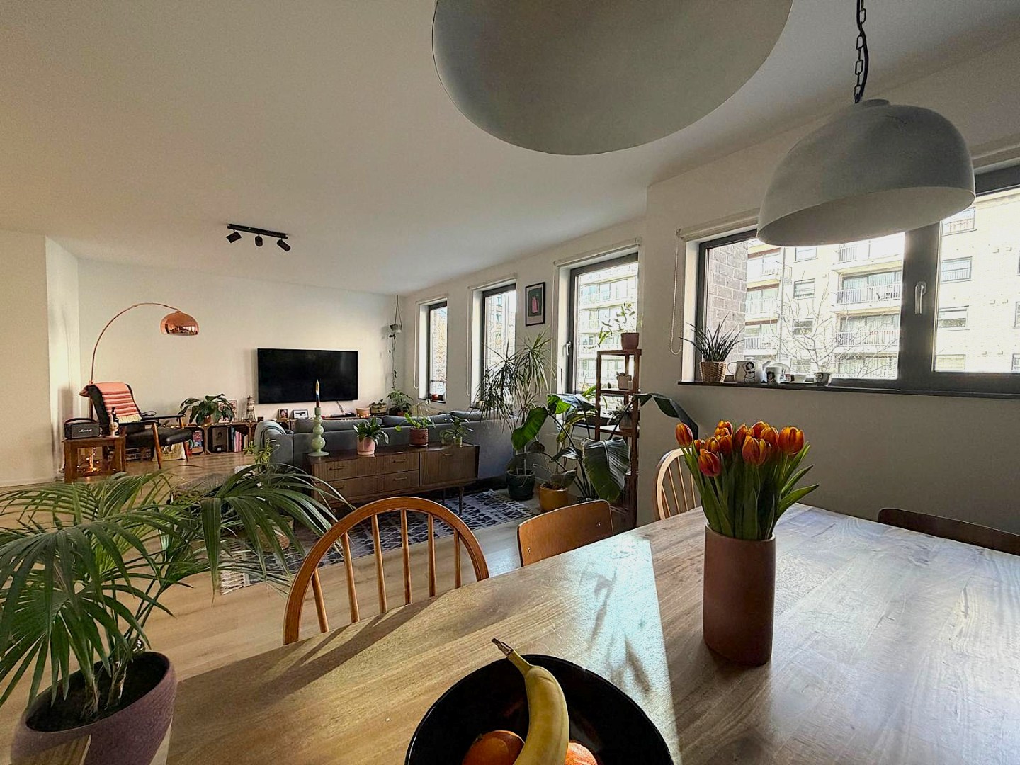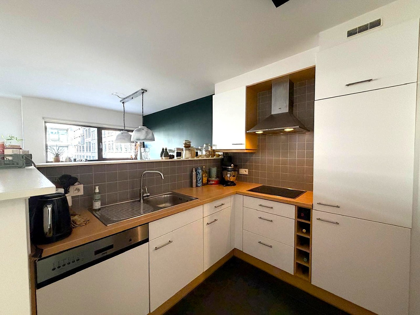 We nemen de trap of lift naar de eerste verdieping en komen binnen in de leefruimte met open keuken, welke veel lichtinval geniet dankzij de raampartijen. Bovendien heeft u een mooi uitzicht door het pleintje dat zich voor het gebouw bevindt.