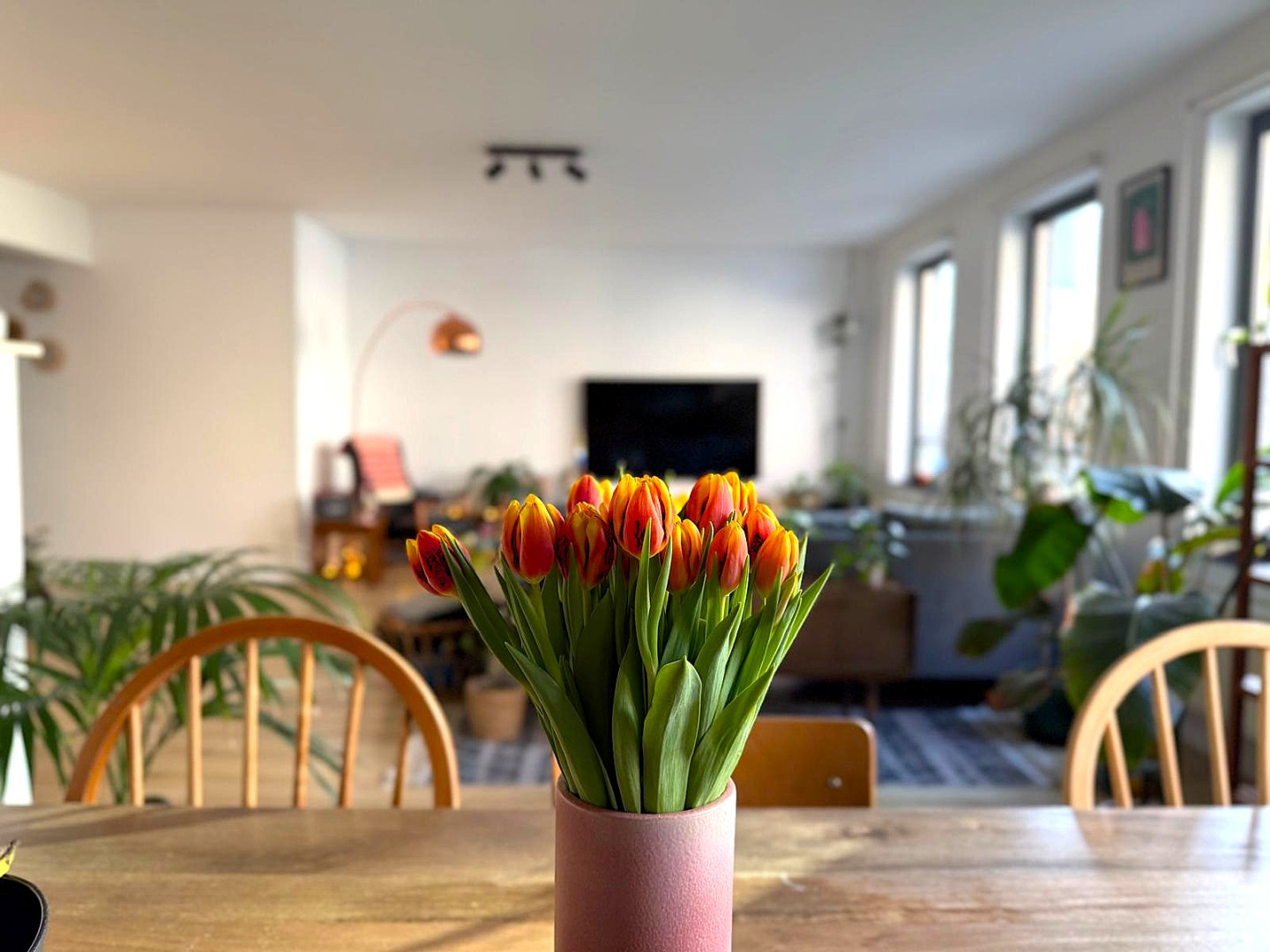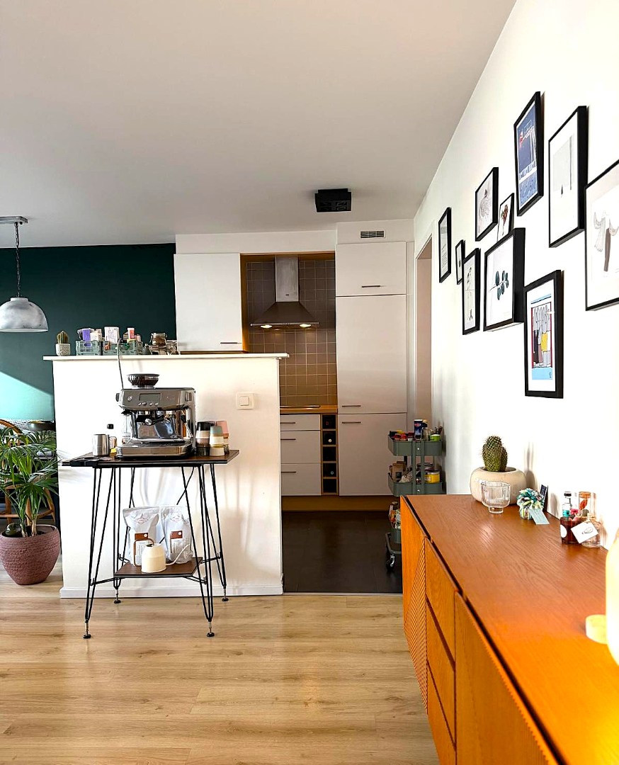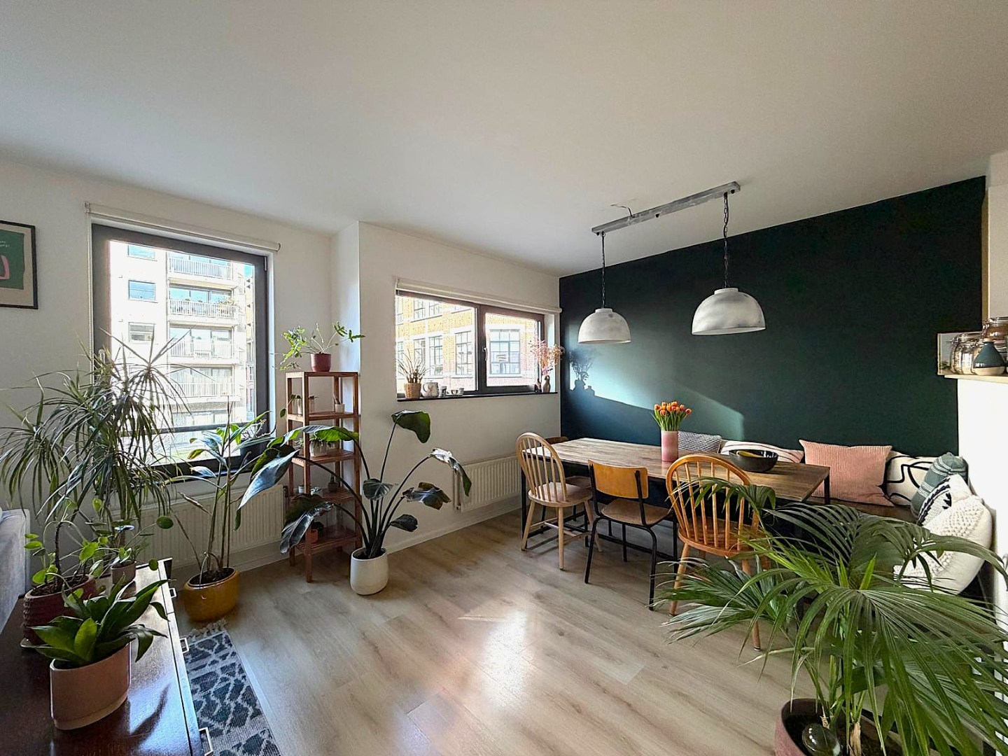We nemen de trap of lift naar de eerste verdieping en komen binnen in de leefruimte met open keuken, welke veel lichtinval geniet dankzij de raampartijen. Bovendien heeft u een mooi uitzicht door het pleintje dat zich voor het gebouw bevindt.