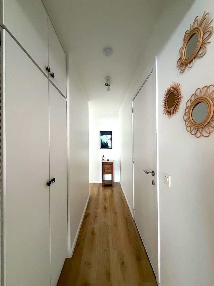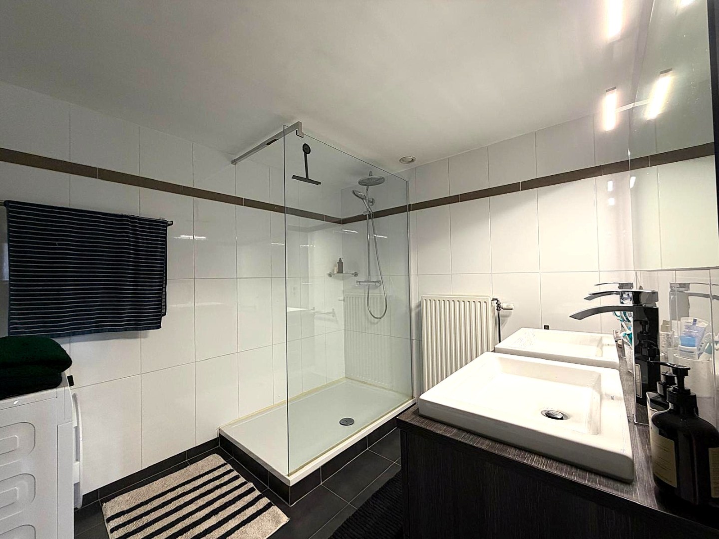 Verder is er nog een badkamer met inloopdouche, een stijlvol lavabomeubel met dubbele lavabo, een spiegelkast en ladekast.