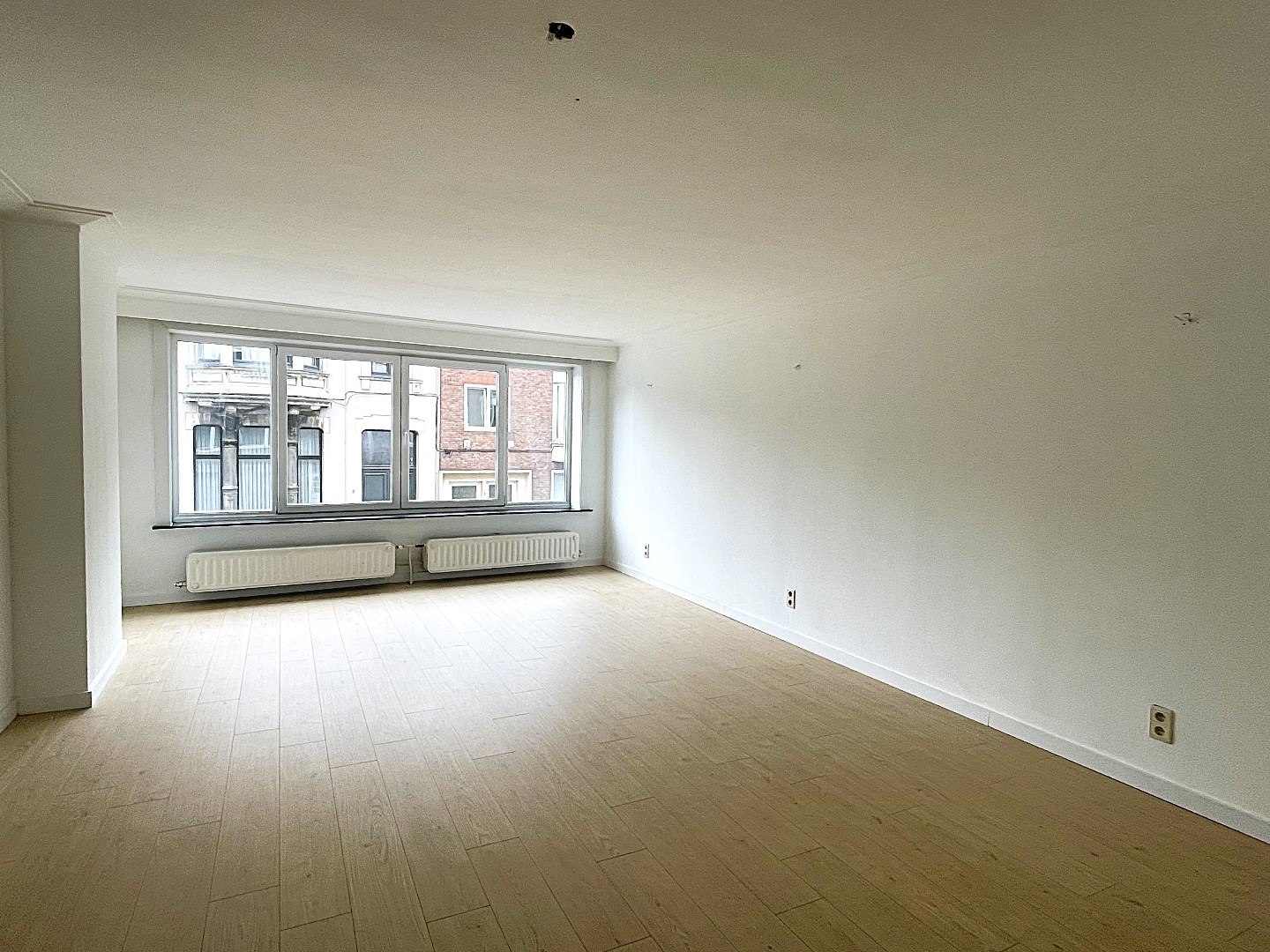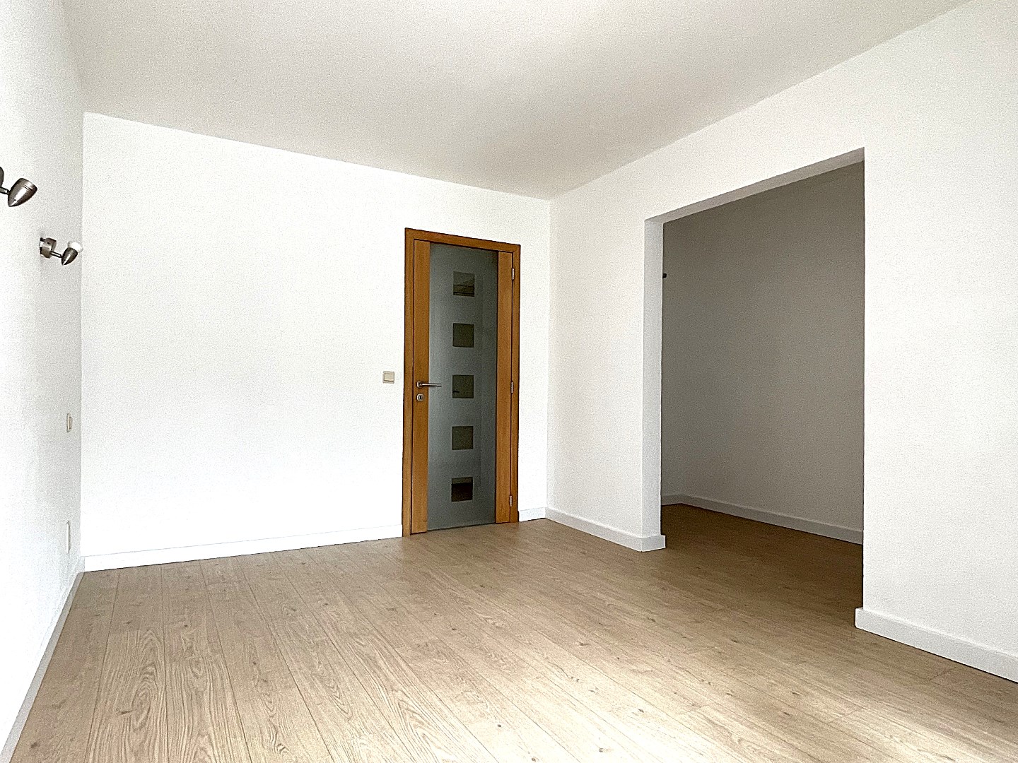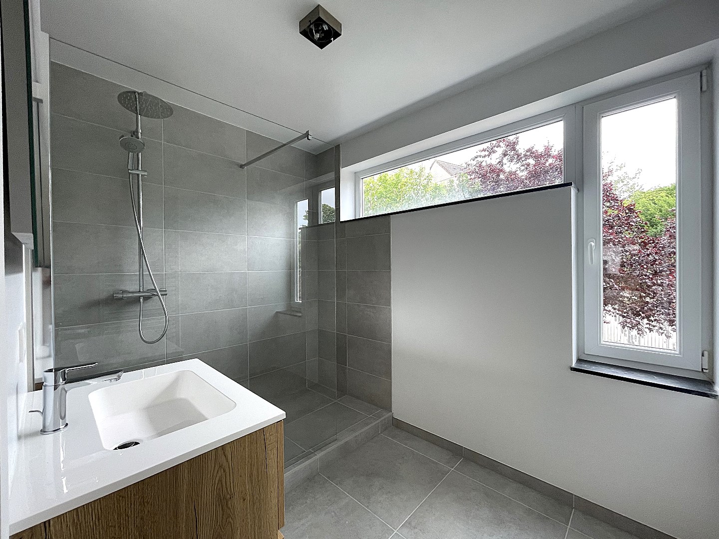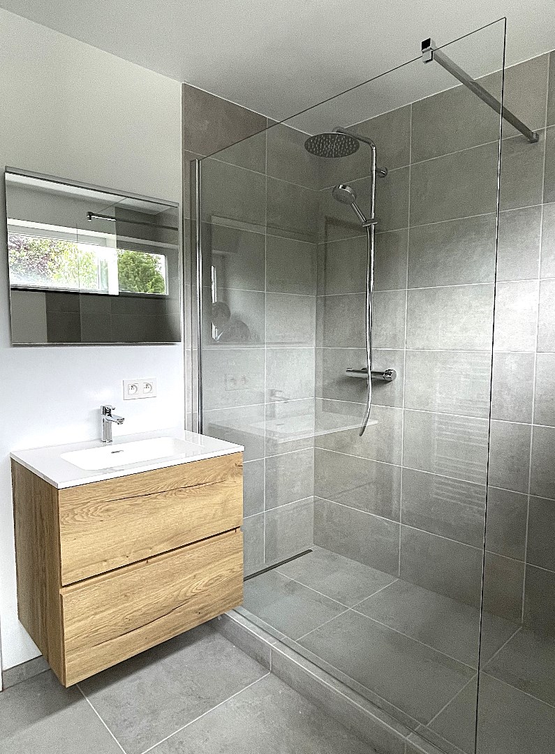 De hal brengt u vervolgens achteraan tot de royale slaapkamer (23m²) op laminaatvloer met een ensuite dressing en een stijlvol vernieuwde badkamer. Deze recent gerenoveerde badkamer is voorzien van een inloopdouche en een lavabomeubel.