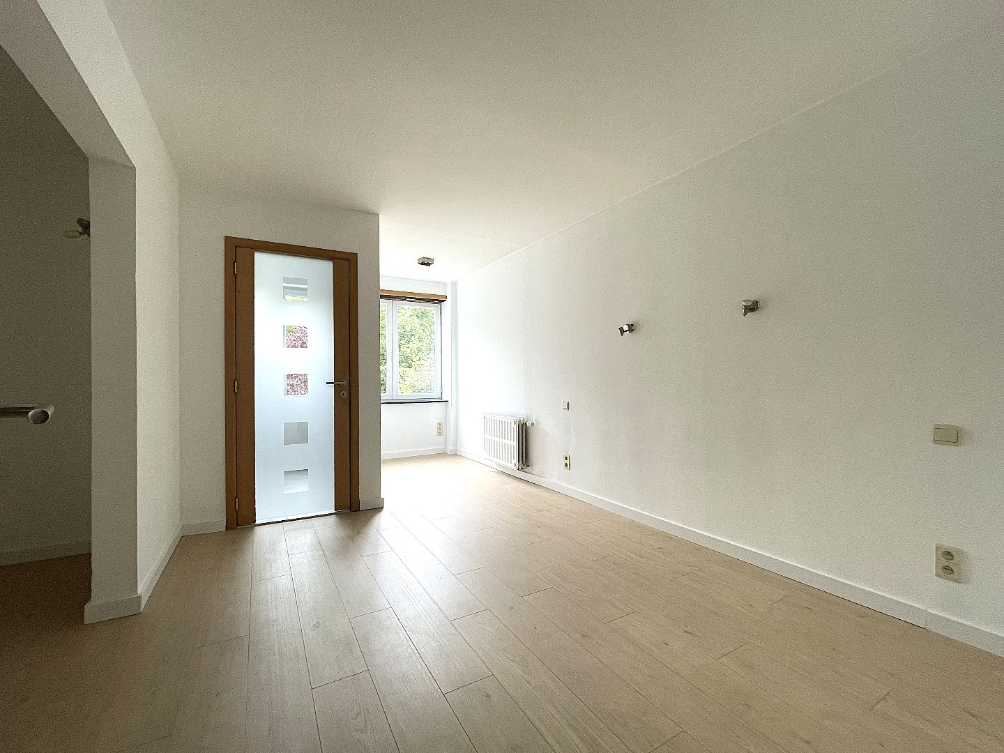 Via de inkomhal met gastentoilet en ingemaakte kasten betreden we de riante woonkamer op laminaatvloer met veel natuurlijke lichtinval. De open keuken is voorzien van kwalitatieve inbouwtoestellen en kastenwerk.