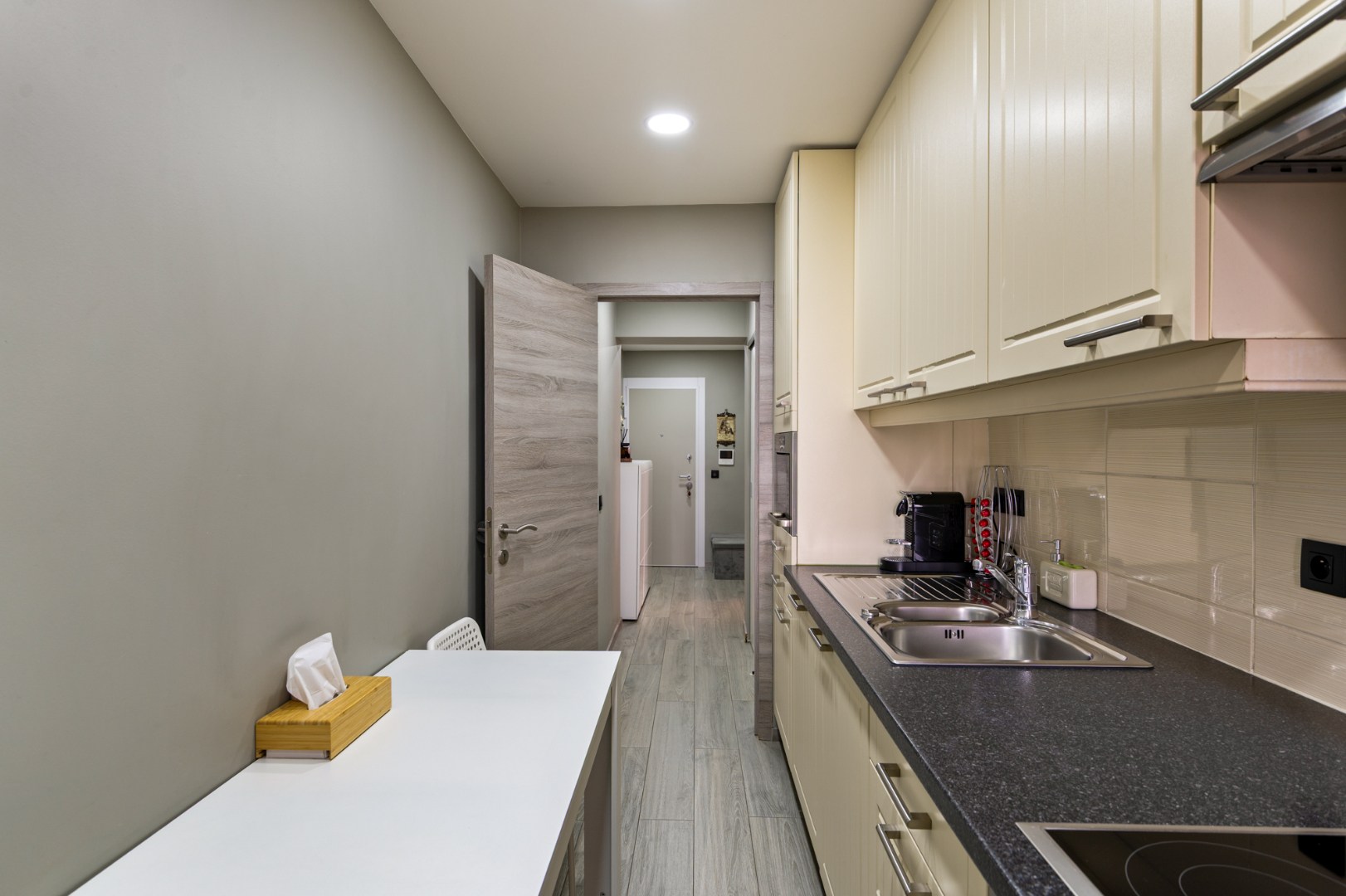 De moderne, volledig ingerichte keuken is voorzien van alle hedendaagse toestellen en sluit aan op een balkon met eveneens een uniek verzicht.
