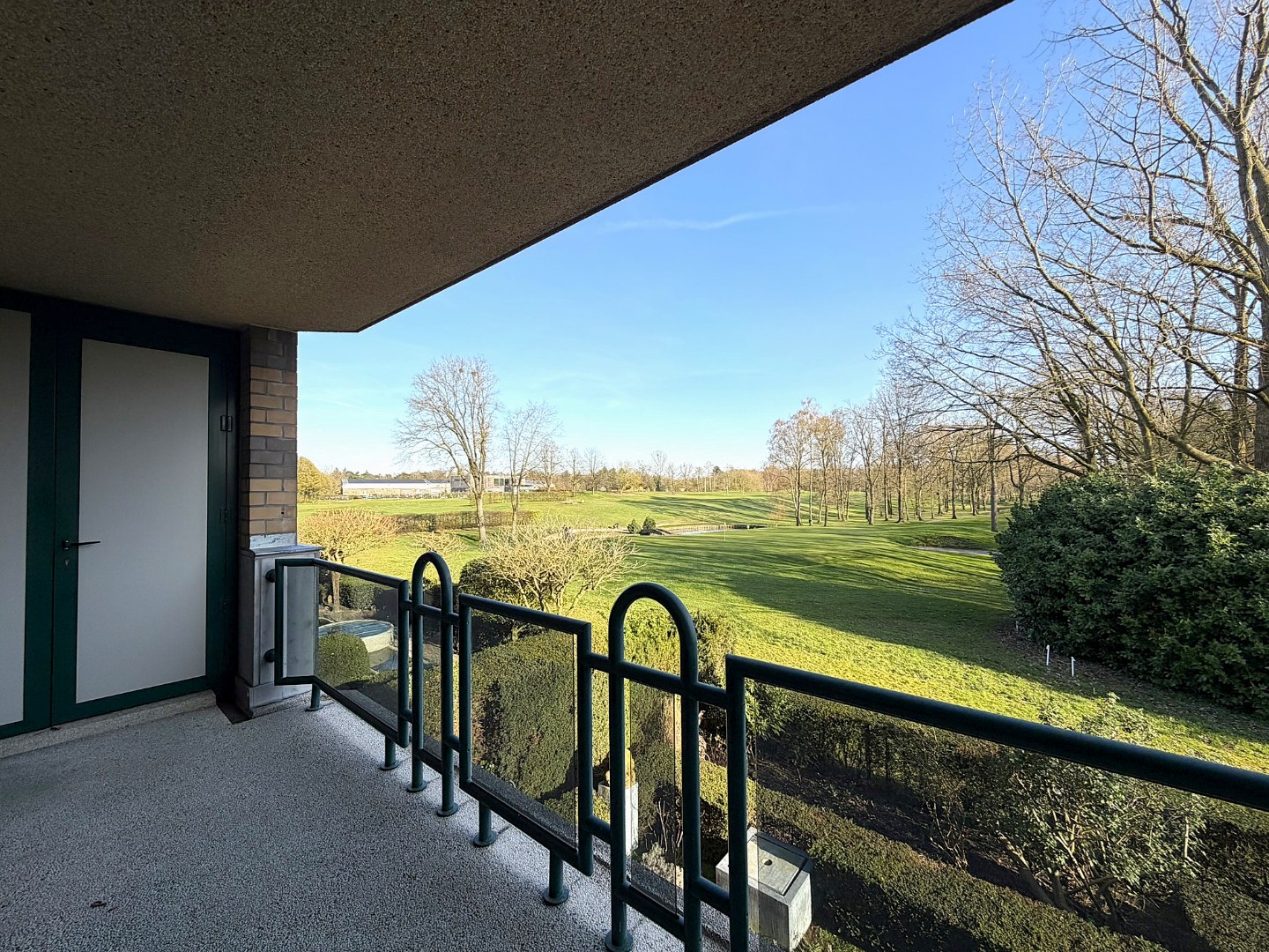 Het ruime terras (6,5m²) vormt een echte meerwaarde en biedt een uniek zicht op de Golf van Brasschaat — een zeldzame en bijzonder rustgevende setting. het beschikt over een bergruimte, handig voor het opbergen van de terrasmeubelen.