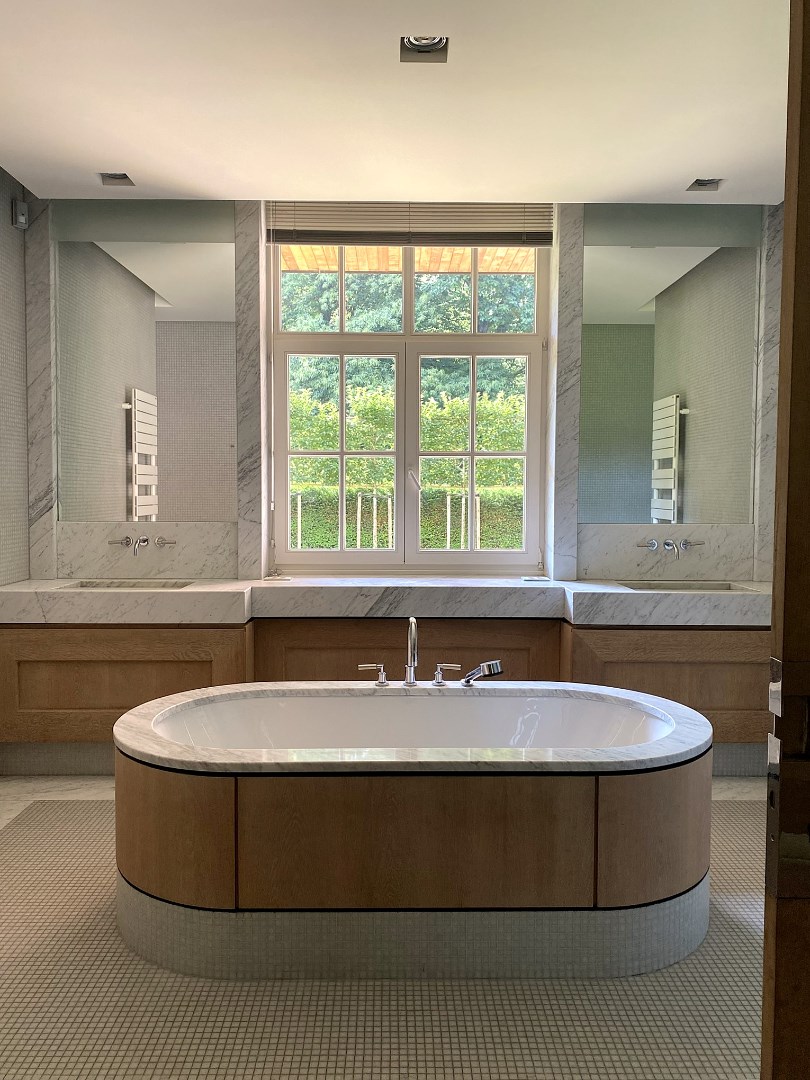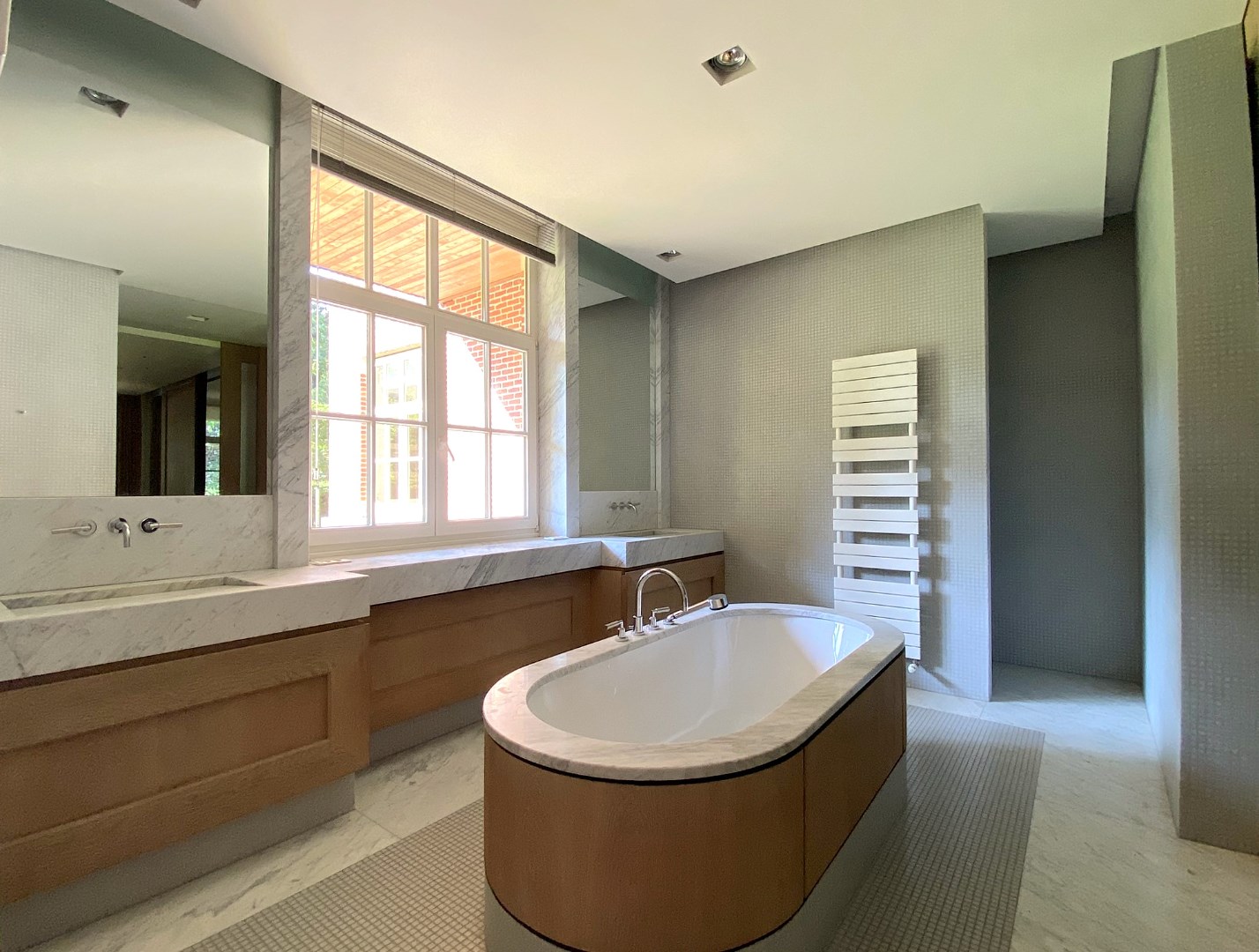 U wordt verwelkomd in de inkomhal met gastentoilet, die leidt naar een royale leefruimte van ca. 84m², met grote raampartijen die toegang geven tot de prachtige parktuin met terrassen en vijver. De keuken vormt een harmonieus geheel met de leefruimte en is uitgerust met alle luxe die u verwacht. Verder is er een handige en zeer ruime kelderberging (48m²). De hal, met ruime vestiaire en gastentoilet, verdeelt de ruimte in twee slaapvertrekken. De ene master bedroom heeft een tegenoverliggende luxe badkamer met vrijstaand ligbad, douche, badkamermeubel met dubbele lavabo en toilet. De andere suite heeft een badkamer met inloopdouche.