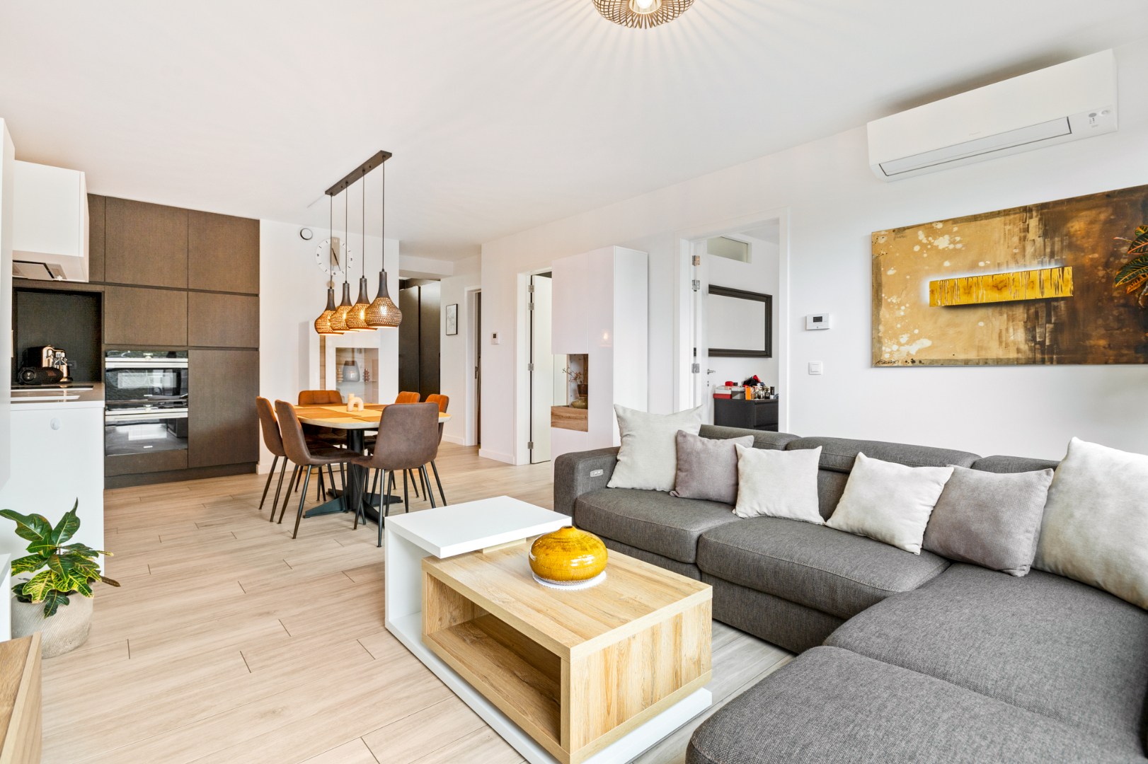 Bij binnenkomst via de zij-ingang, betreedt u het lichtrijke en energiezuinige appartement dat modern leefcomfort combineert met een stijlvolle afwerking. De inkomhal met praktische ingebouwde vestiairekasten en een gastentoilet, .verwelkomt u en geeft meteen een warm gevoel. Vanuit de hal heeft u toegang tot de royale leefruimte, afgewerkt met een elegante parkettegelvloer en uitgerust met airconditioning. De grote raampartijen zorgen voor overvloedig natuurlijk licht en bieden een directe verbinding met het zonnige terras en tuin.