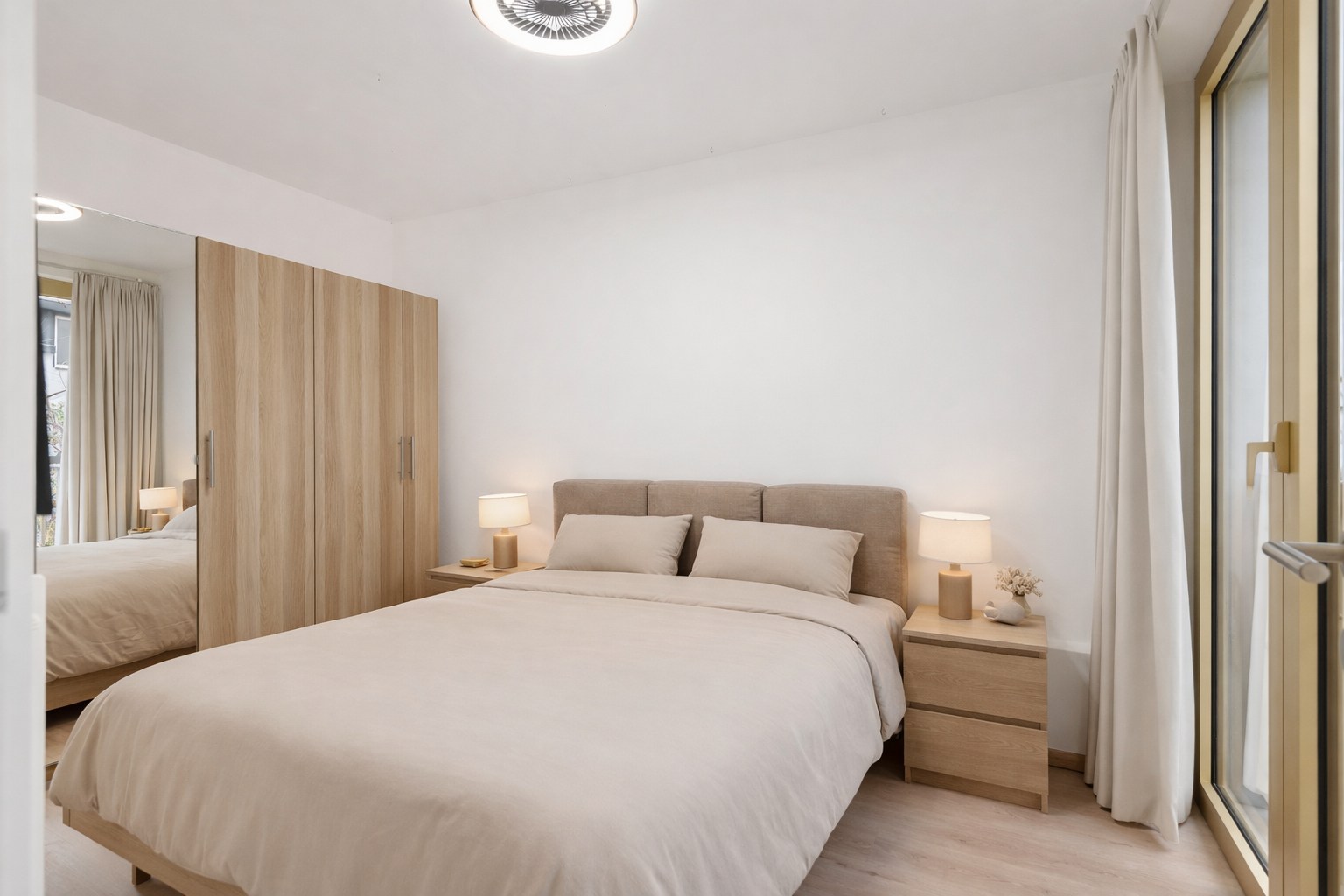 Op het gelijkvloers komt u binnen via de inkomhal met gastentoilet. De lichtrijke leefruimte sluit naadloos aan op de open keuken en biedt rechtstreekse toegang tot de aangename tuin met terras. Aansluitend vindt u een handige technische berging onder de trap. Verder is er een ruime slaapkamer of bureau op het gelijkvloers, en een praktische douchekamer met aansluitingen voor wasmachine/droogkast en plafondhoge bergkasten.