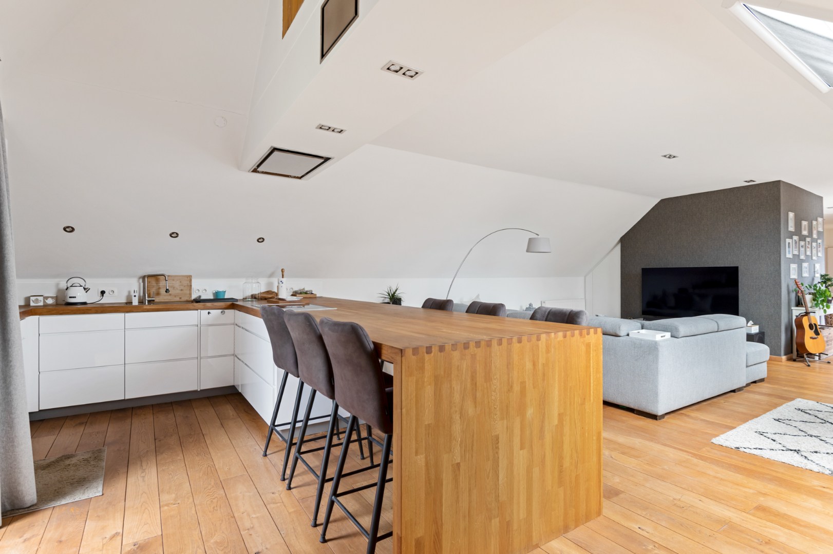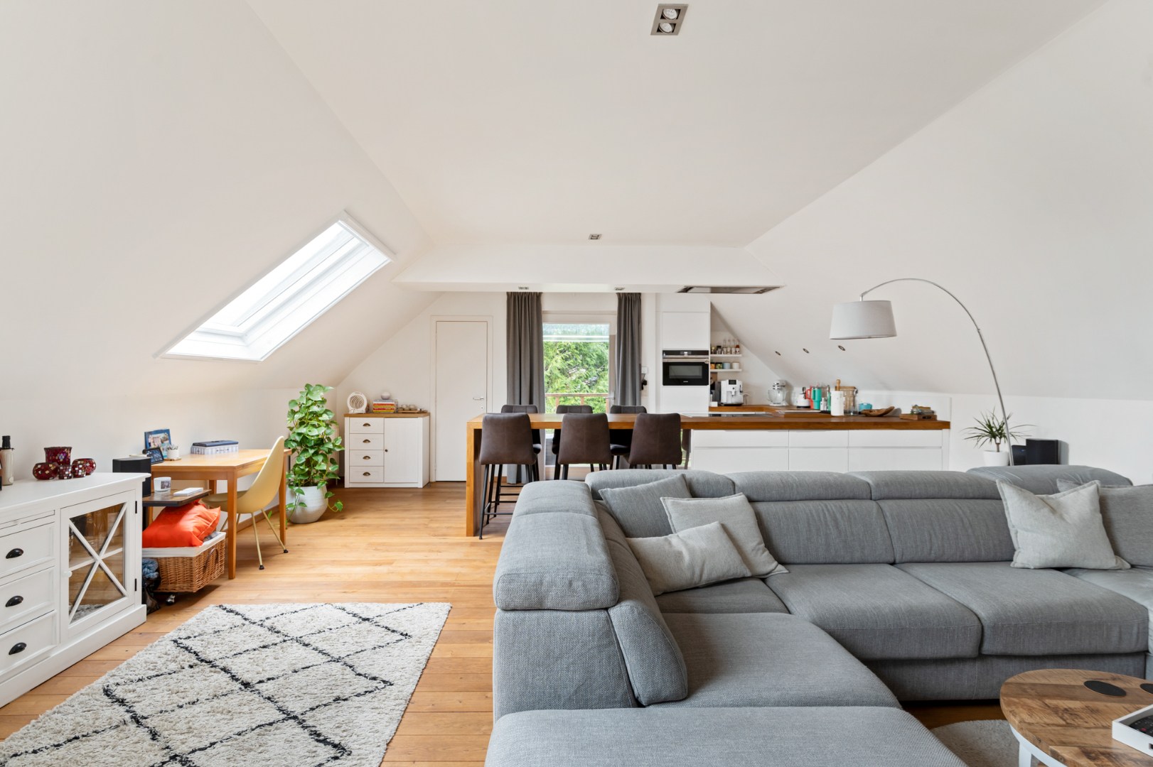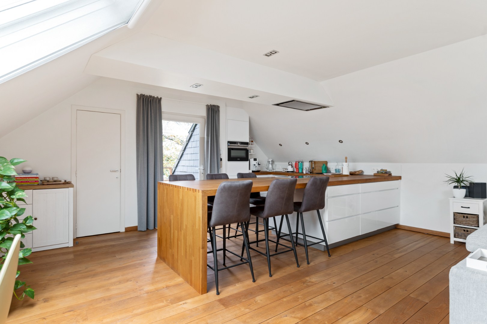 Het unieke appartement combineert modern comfort met een stijlvolle afwerking en verwelkomt u via een ruime inkomhal, voorzien van een gastentoilet en ingemaakte vestiairekasten. De hal leidt naar de royale leefruimte van +/- 50 m², afgewerkt met een elegante parketvloer en ramen die zorgen voor een overvloed aan natuurlijk licht. De open designkeuken is een ware eyecatcher en geheel uitgerust met hoogwaardige inbouwtoestellen, maatkasten en een groot eeteiland met plek voor zes Personen. Aangrenzend vindt u een praktische berging en een compact overdekt buitenterras. Centraal in het appartement geven grote schuiframen toegang tot het grote zuidwest georiënteerde terras, waar u kan genieten van een prachtig verzicht.
