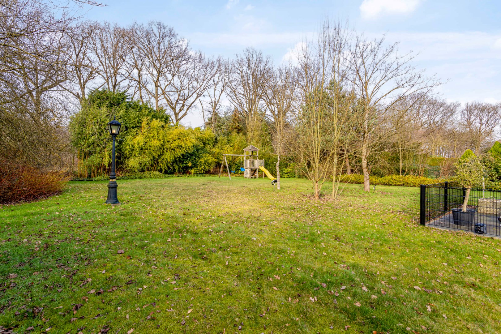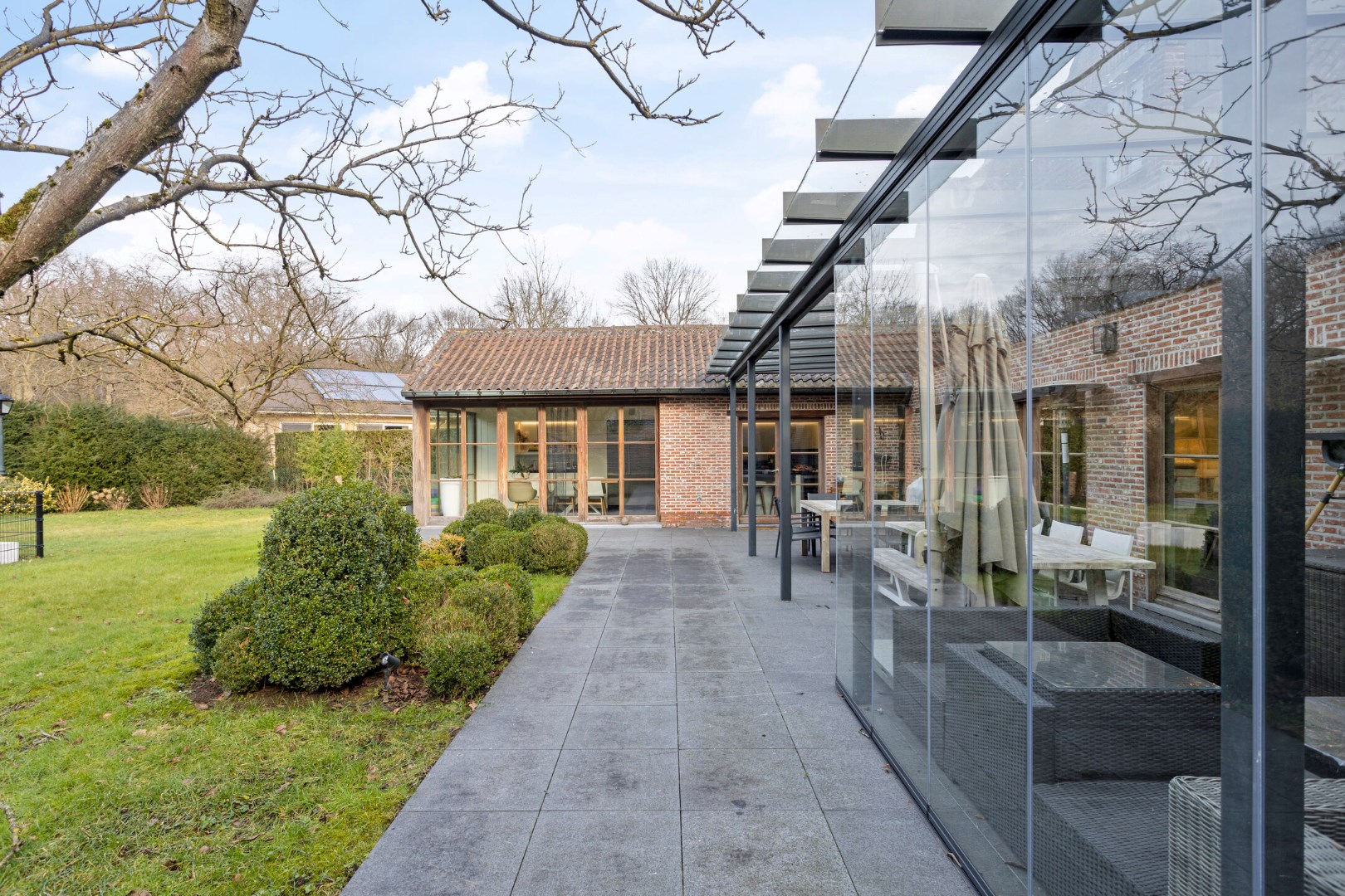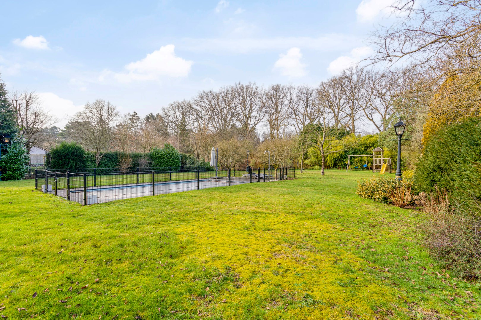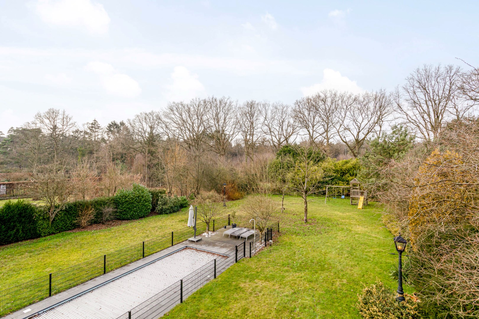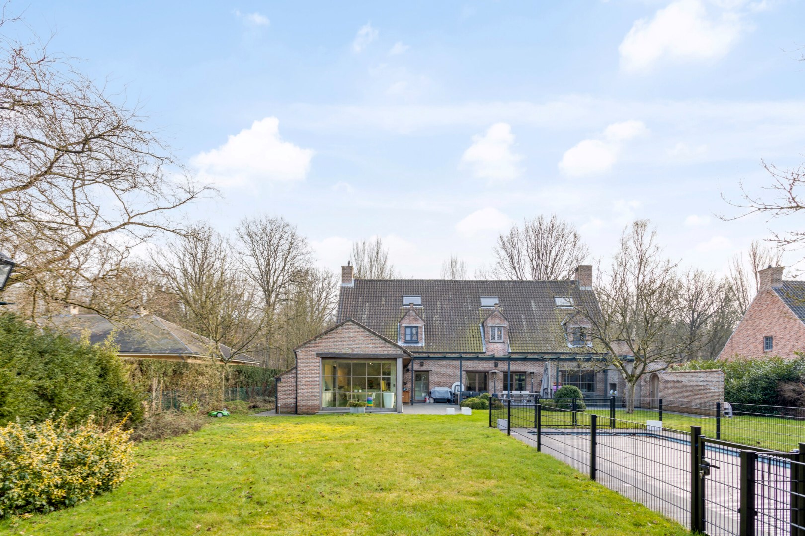De mooi aangeplante parktuin met groen verzicht, biedt een oase van rust en absolute privacy! Achteraan bevinden zich zongerichte terrassen, waarvan 1 overdekt en voorzien van een lounchehoek met buitenhaard . Het omheinde zwembad, met een solardek en warmtepomp maakt dit geheel compleet!