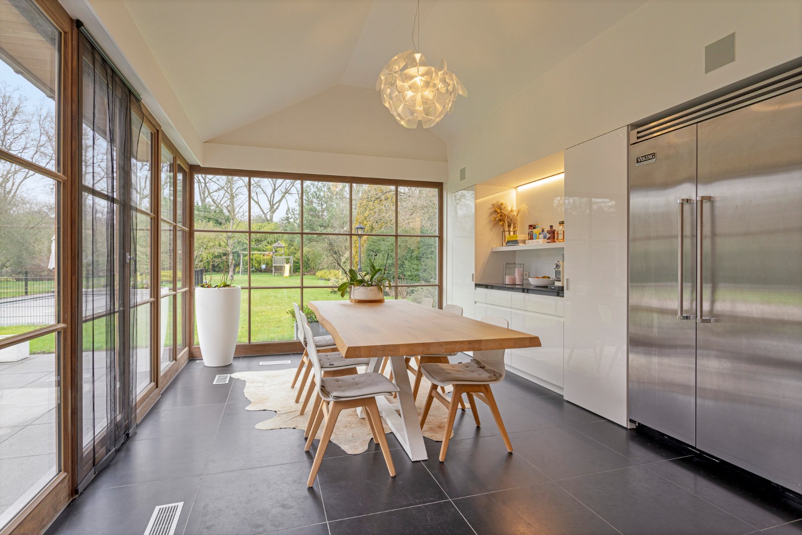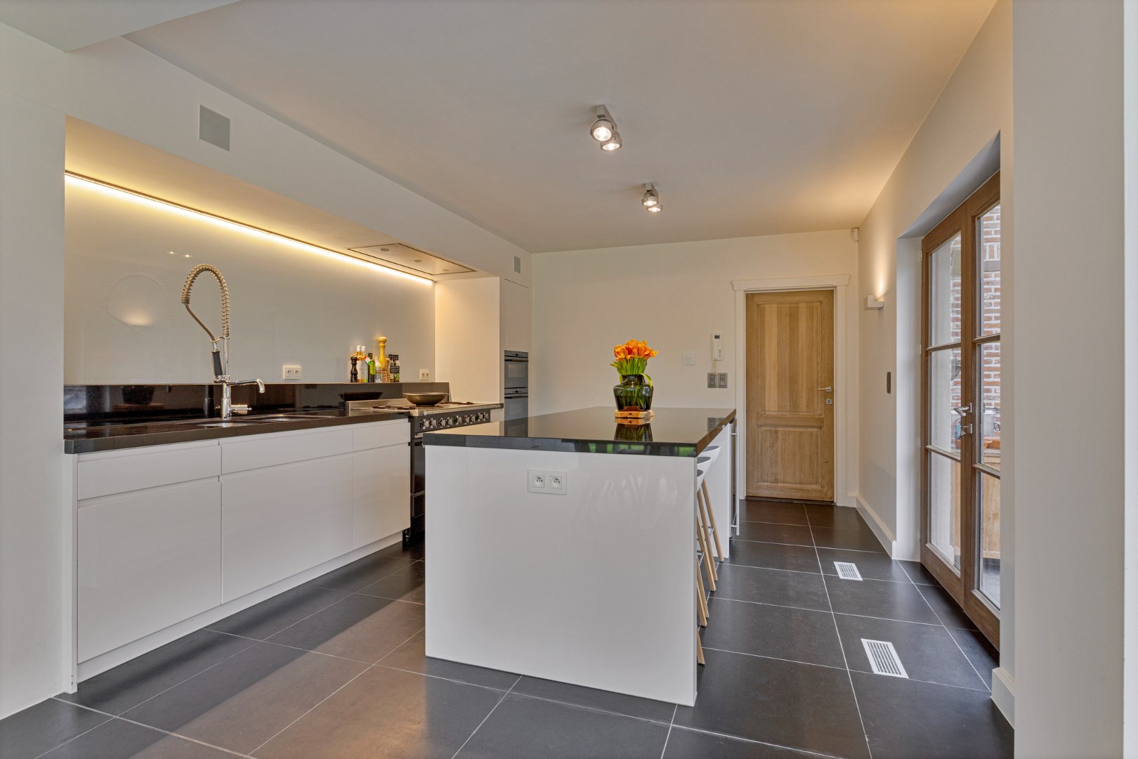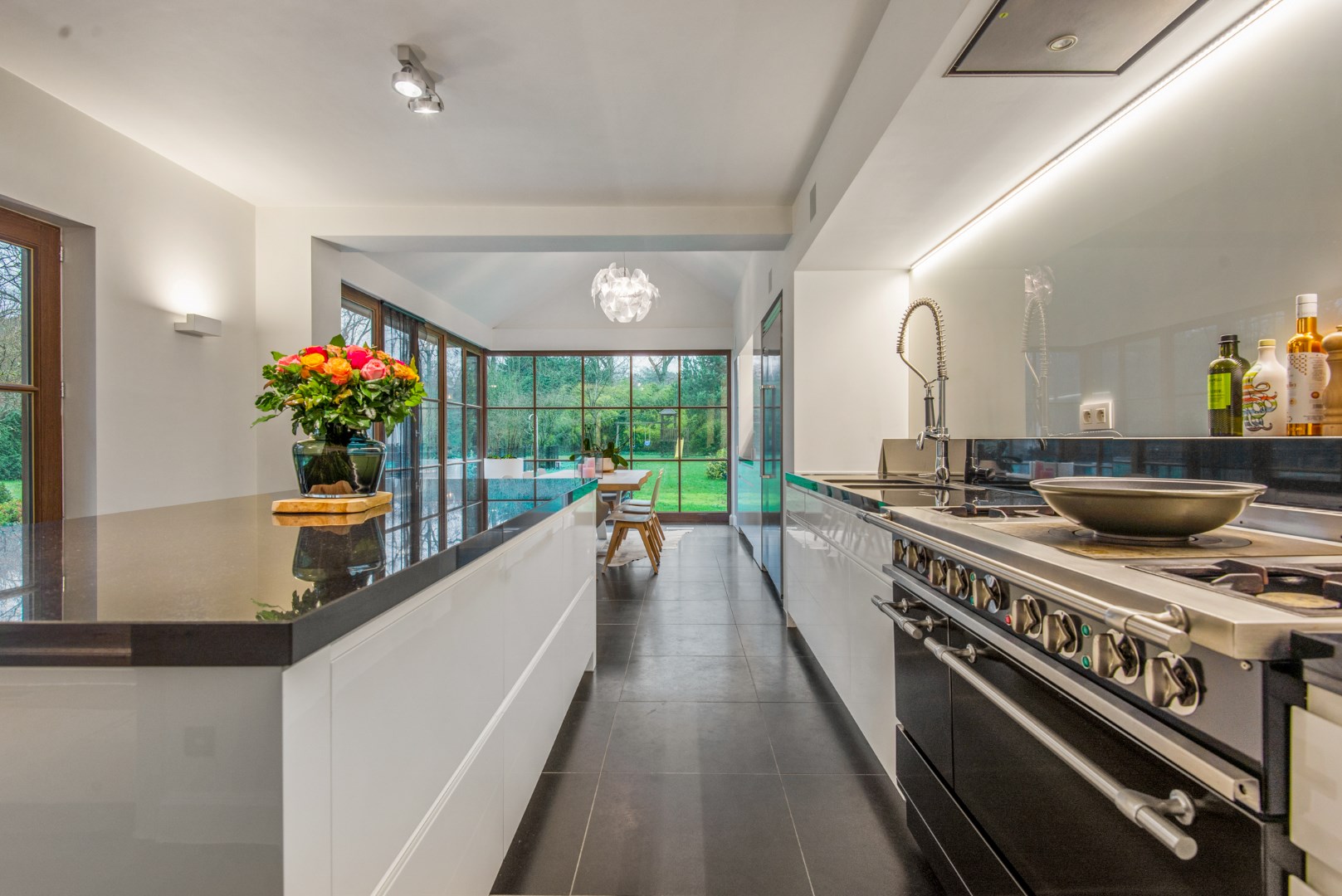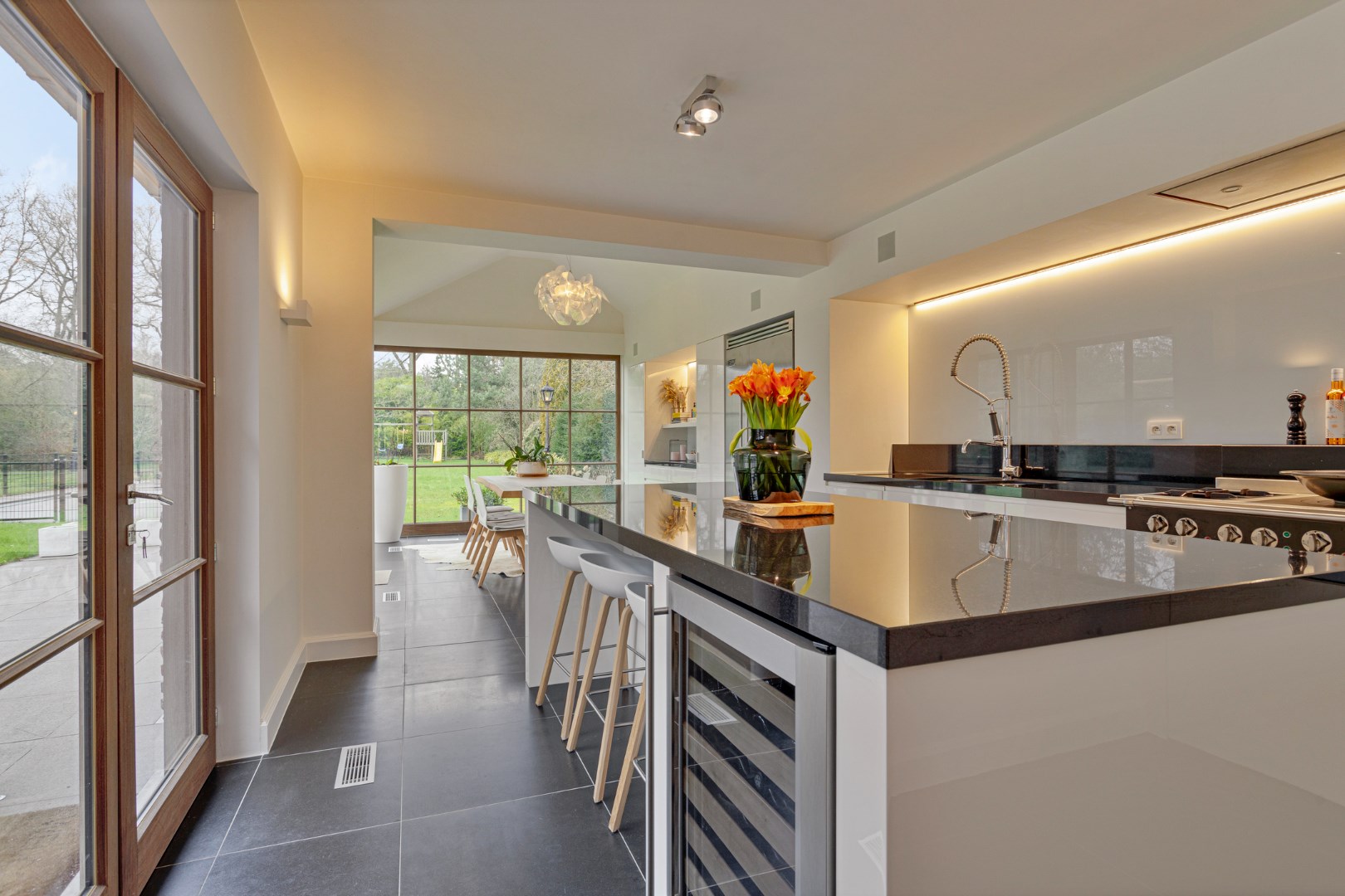 U betreedt de villa middels de inkomhal waar de prachtige houten trap u direct de charme en het karakter overbrengt. De riante, lichtrijke leefruimte op tegelvloer omvat de zit- en eetkamer en is voorzien van een nieuwe inbouwhaard en talrijke raampartijen, dewelke zorgen voor veel natuurlijke lichtinval en een mooi zicht op de parktuin. De aanpalende tuinkamer omvat de nieuwe, hyper ingerichte designkeuken voorzien van een eiland, kwalitatieve inbouwtoestellen, een ingebouwde wijnkoeler, een gasfornuis en een eethoek met directe verbinding tot het terras en de tuin. Verder is er een stijlvol gastentoilet en een ruime, dubbele garage met automatische poort en ingemaakte op bergkasten voorzien.