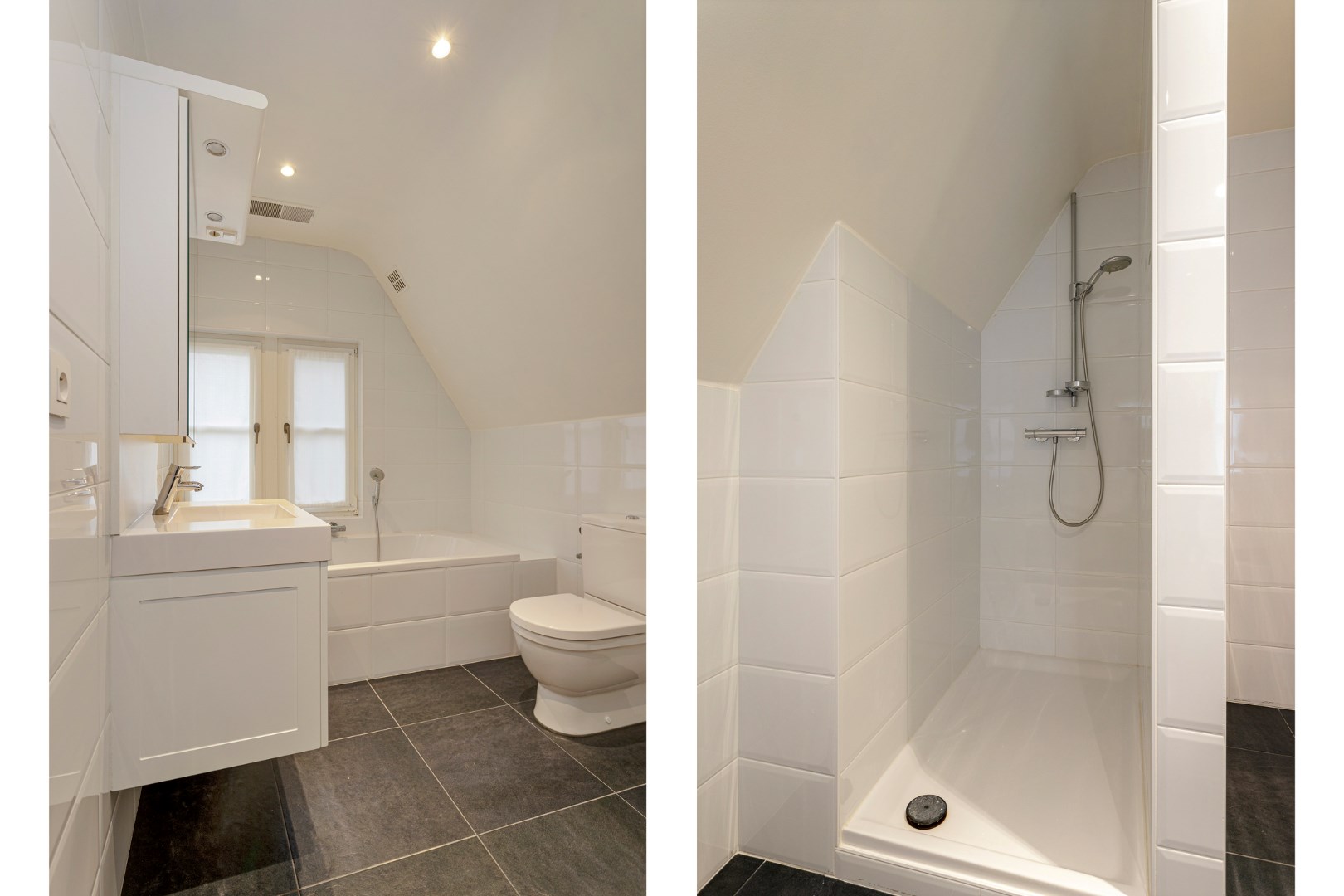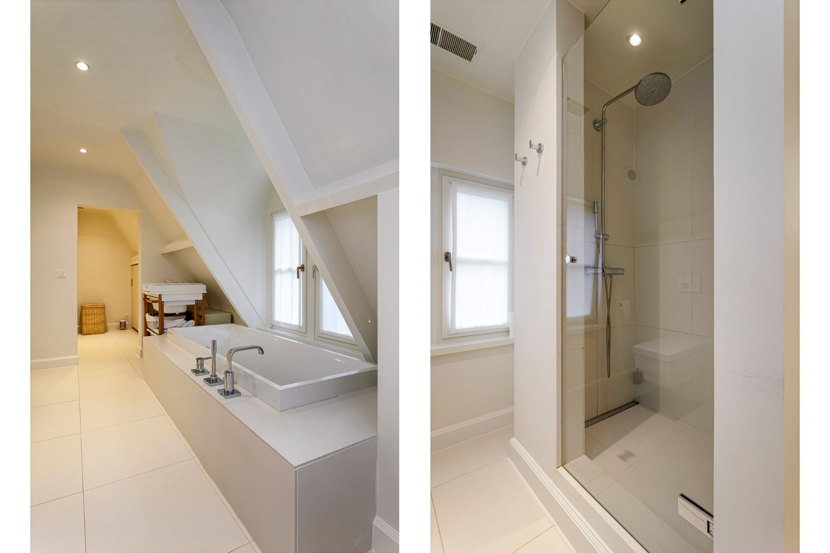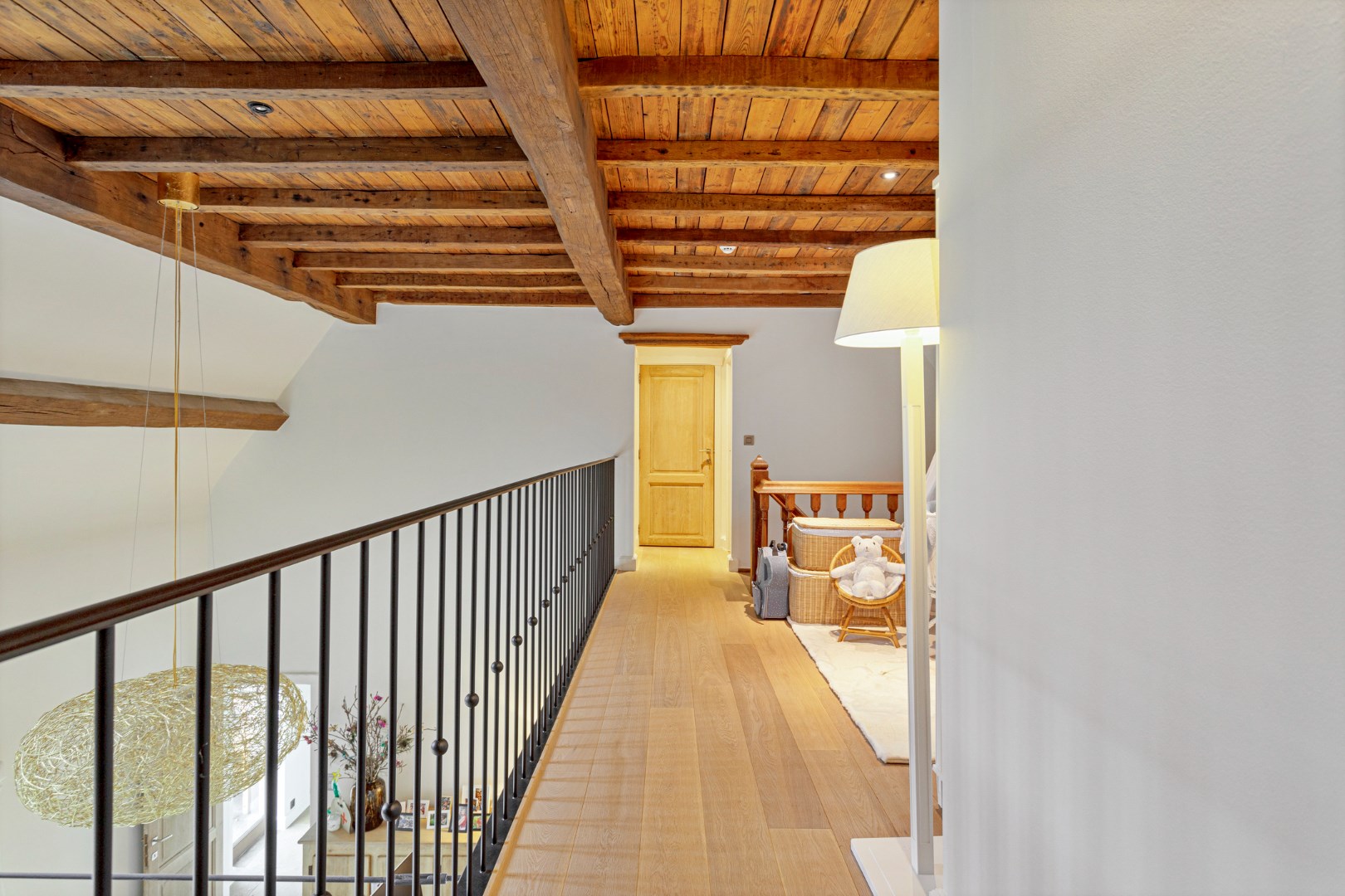 Bij het betreden van 1ste verdieping staat de vide centraal, deze omvat een multifunctionele ruimte en geeft toegang tot 2 riante slaapkamers en een berging. De masterbedroom op parketvloer beschikt over ingemaakte kasten, een doorloopdressing en een ensuite, stijlvol ingerichte badkamer voorzien van een ligbad, toilet, dubbel wastafel en douche. De 2de slaapkamer beschikt eveneens over maatkasten en een ensuite badkamer met ligbad, toilet en douche.