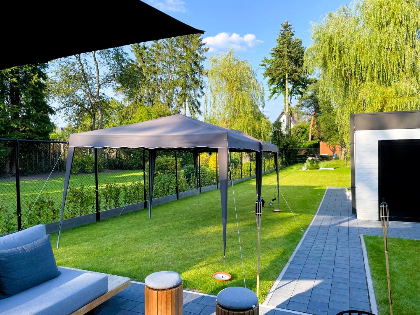 De tuin biedt een oase van rust en privacy met een mooi groen uitzicht. De voortuin beschikt over een automatische poort en een oprit. Achteraan geniet u van een ruim terras en een aangename tuin met tuinberging.