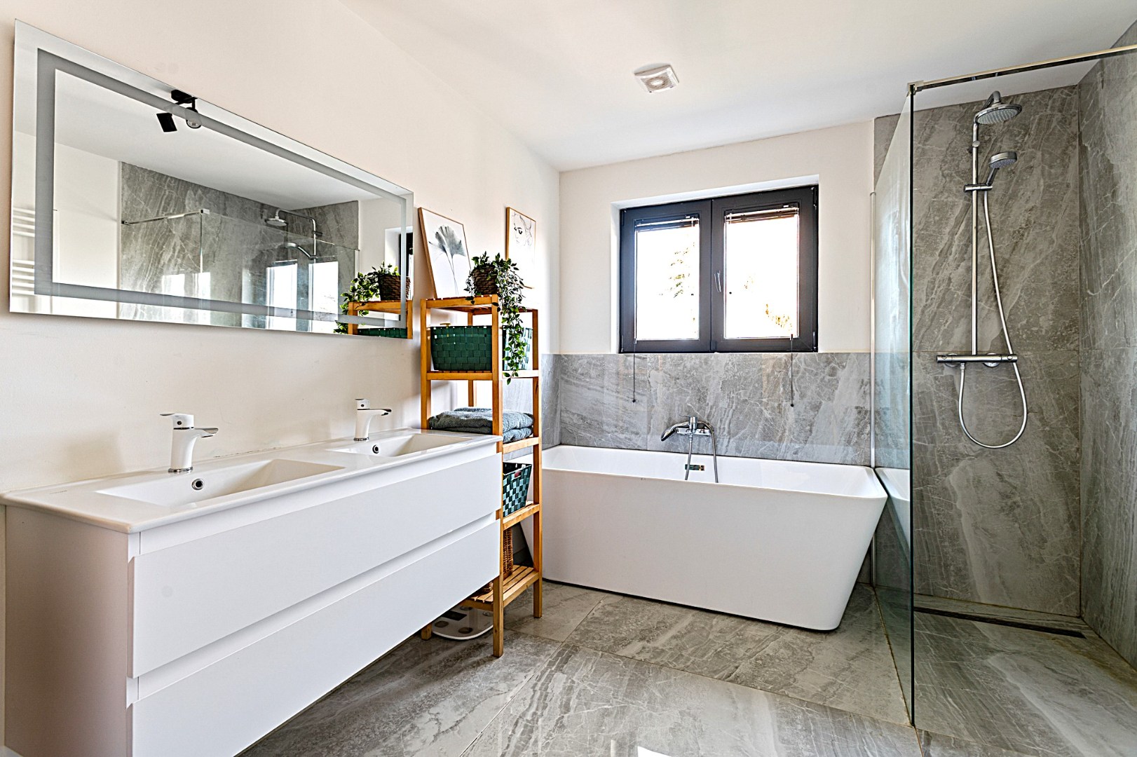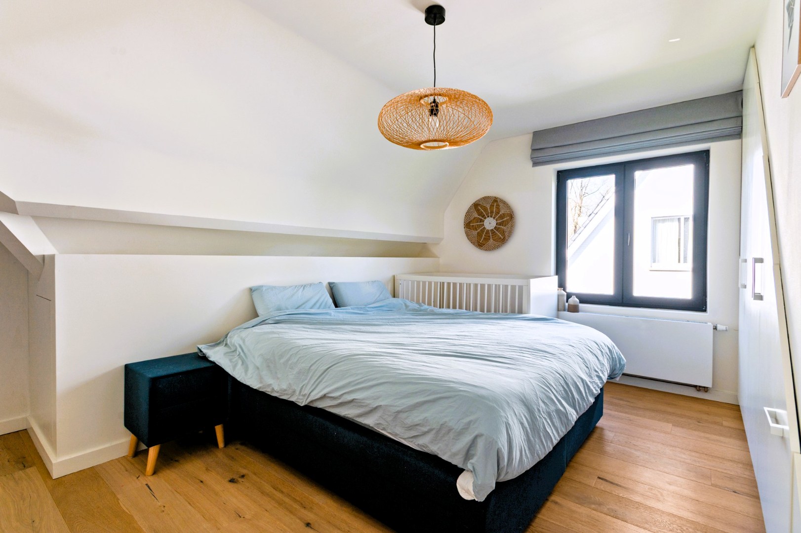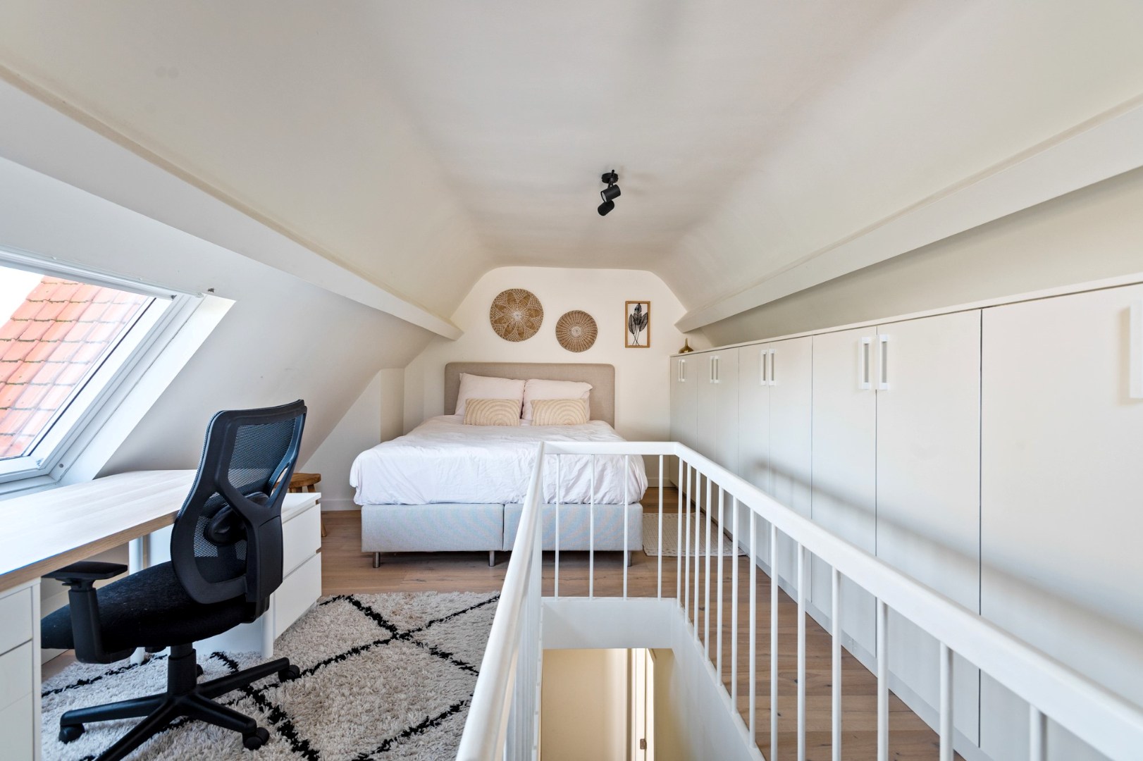 Een elegante trap leidt u naar de eerste verdieping, waar u twee ruime slaapkamers op parketvloer en de badkamer aantreft. De masterbedroom is voorzien van ingemaakte kasten en de stijlvolle badkamer is ingericht met een dubbel lavabomeubel, een toilet, een inloopdouche en een ligbad. Op de tweede verdieping bevindt zich een grote, volledig ingerichte kamer met ingemaakte kasten – perfect als slaapkamer, hobbyruimte of thuiskantoor.