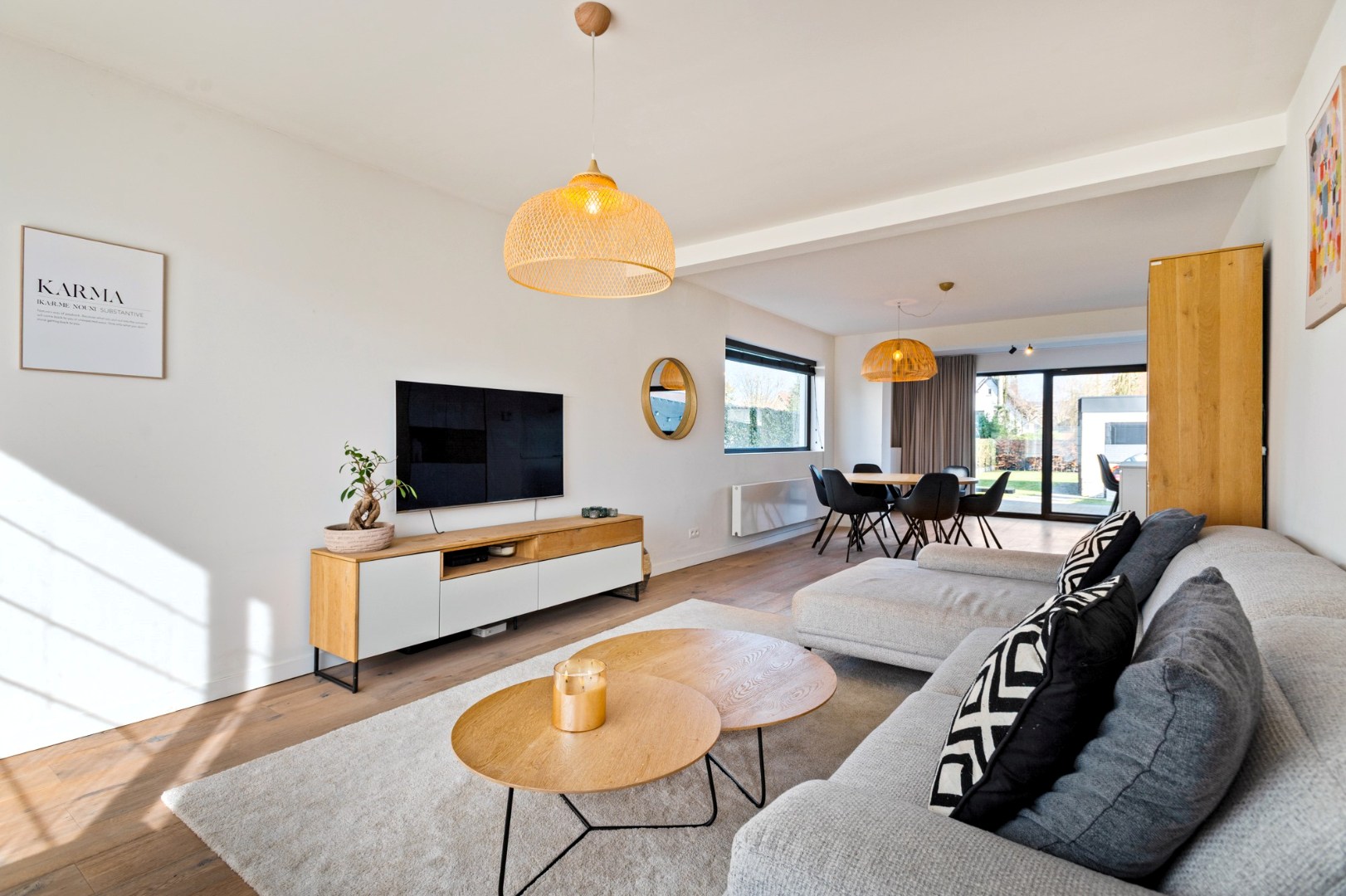 Bij het betreden van de woning wordt u verwelkomd in een stijlvolle inkomhal met gastentoilet. De royale leefruimte met een oppervlakte van 50 m² baadt in het licht dankzij de grote raampartijen en straalt warmte en elegantie uit met haar prachtige parketvloer. Vanuit de woonkamer geniet u van een directe toegang tot het terras en de tuin – ideaal om binnen en buiten naadloos in elkaar te laten overvloeien.