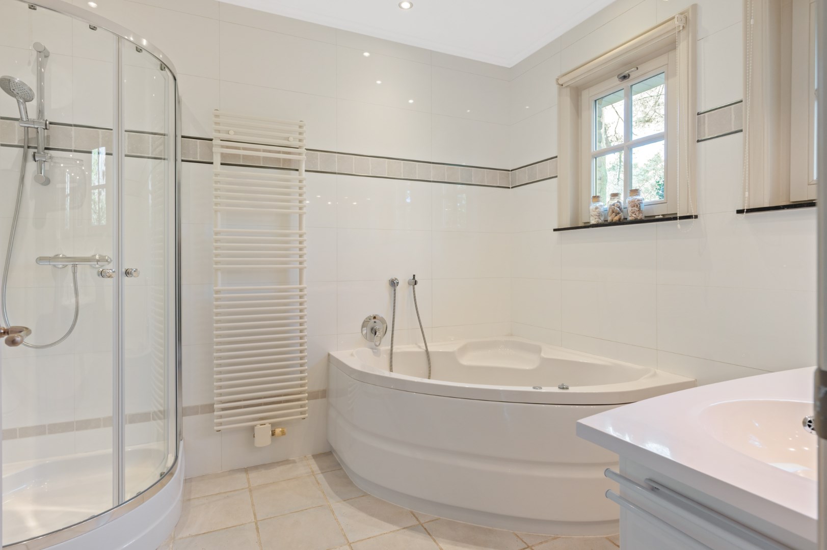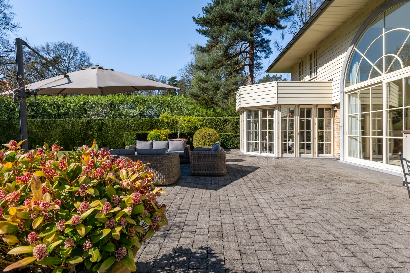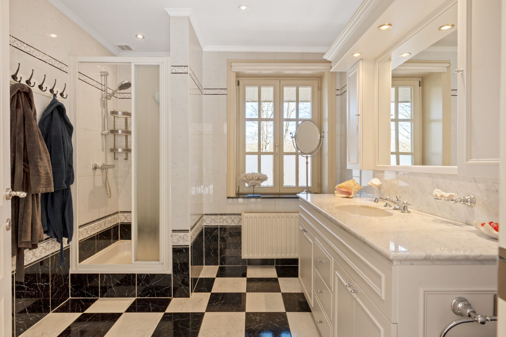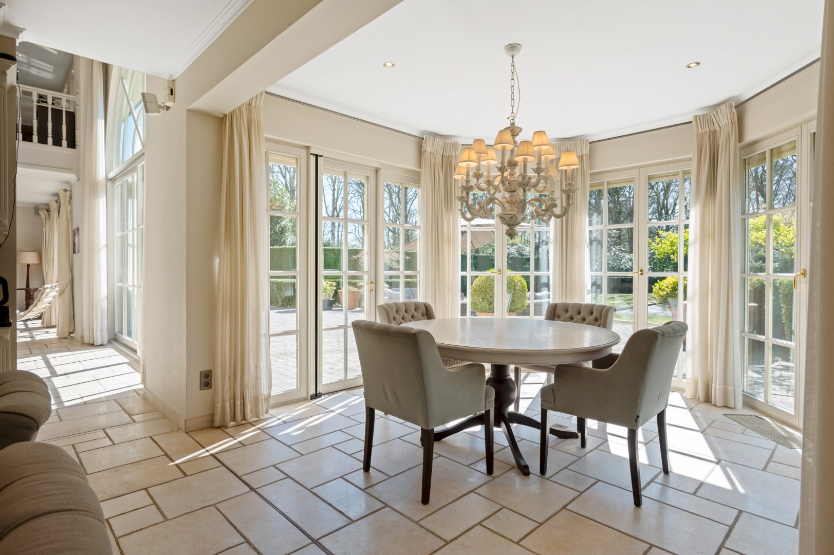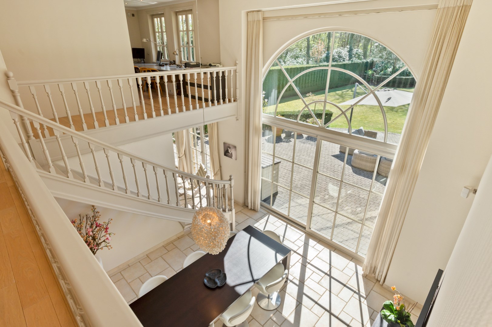 Via de poort rijdt u op en heeft u verschillende parkeerplaatsen. Bij het binnenkomen geeft de statige hal de allure van de villa weer, maar valt vooral de fraaie lichtinval op. Aan de rechterzijde is er een gastenverblijf voorzien van een luxe badkamer met ligbad, douche en toilet. Deze ruimte kan eventueel ingericht worden als kantoor of praktijk of is perfect voor een inwonende ouder of familielid. De hal brengt ons tot het riante leefgedeelte op bourgondische dals, bestaande uit een zitplaats met haard, een TV-hoek en centrale eetkamer, die aansluit bij de ultra ingerichte leefkeuken. Een absolute eyecatcher is de vide en het fraaie centrale en nokhoge raam, welk de binnenkant met de tuin connecteert en zorgt voor fantastisch uitzicht. De keuken in landelijke stijl is uitgerust met kwalitatieve toestellen, voldoende kastenwerk en een ontbijthoek in de erker.... kortom alle comfort die u verwacht. Alle ruimtes zijn voorzien van grote raampartijen die zorgen voor veel natuurlijke lichtinval en een mooi uitzicht op de prachtig aangelegde tuin met zonneterras en vijver. Verder treffen we een bijkeuken met voorzieningen voor wasmachine/droogkast en zij-ingang. De ruime inpandige garage voorzien van een automatische poort die plaats biedt voor 2 wagens.
