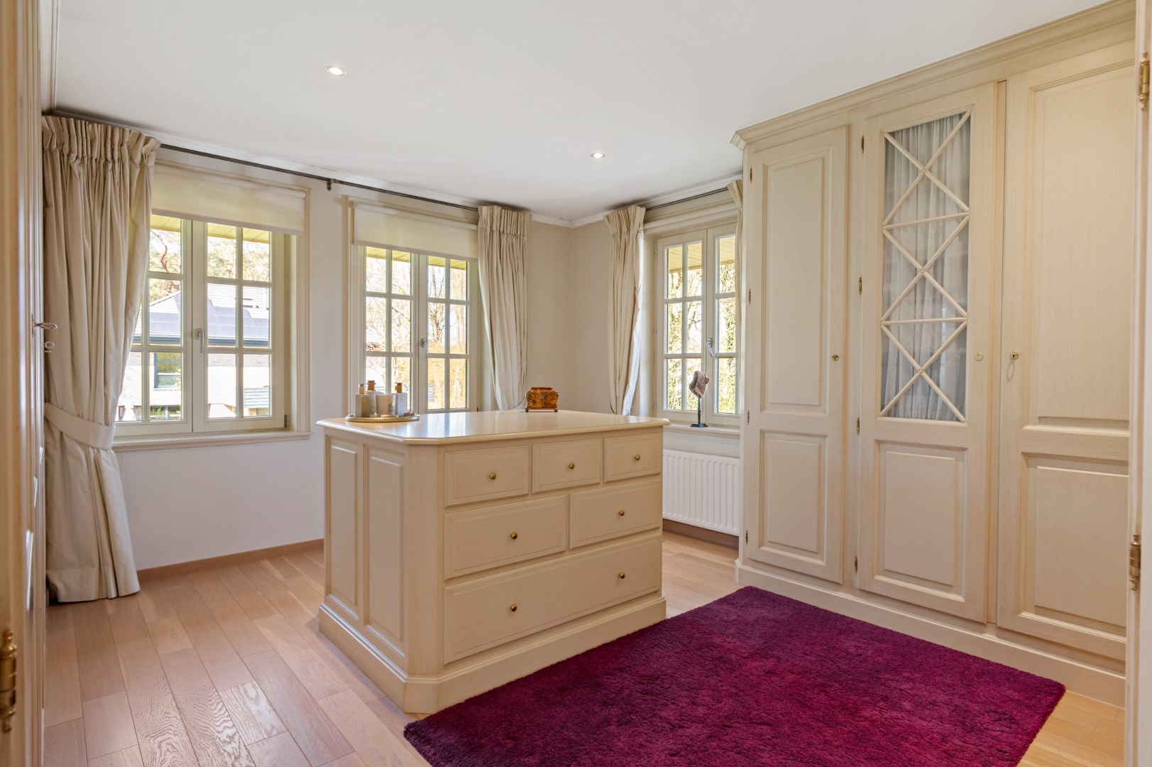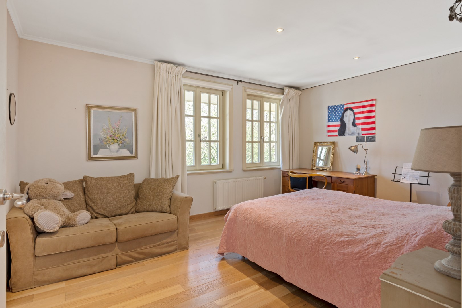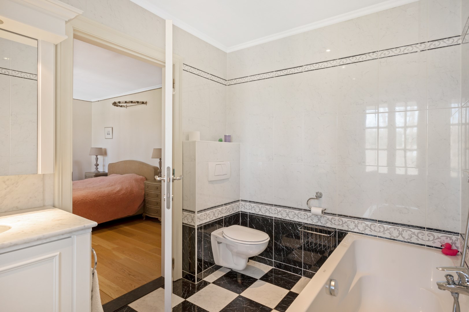 De stijlvolle trap brengt u tot de eerste verdieping waar de overloop op parketvloer toegang geeft tot, enerzijds de masterbedroom met aansluitend een ruime kamer ingericht als dressing. Centraal is er een stijlvol ingerichte badkamer met douche, badkamermeubel en toilet. Ten slotte zijn er nog 2 ruime slaapkamers, waarvan één met private badkamer met ligbad, badkamermeubel en toilet. Ten slotte is er nog een open bureau.