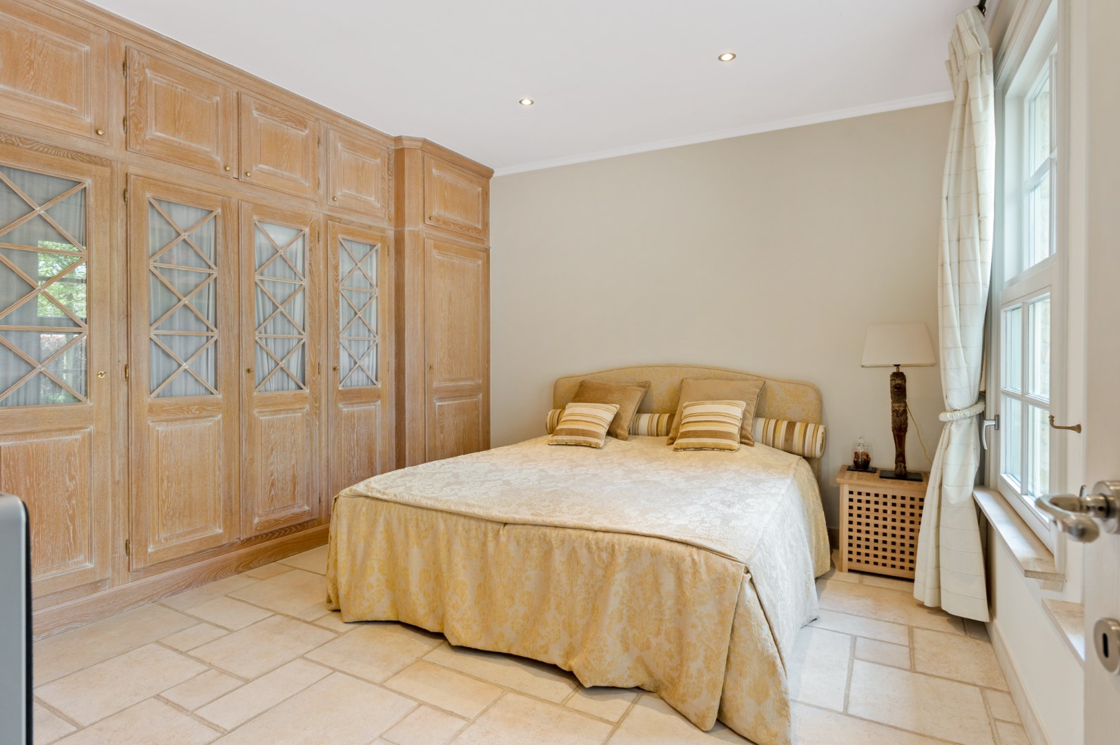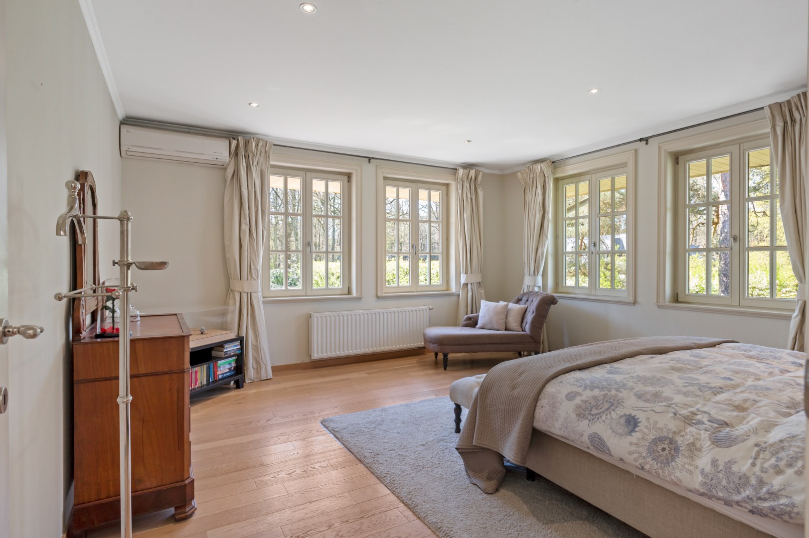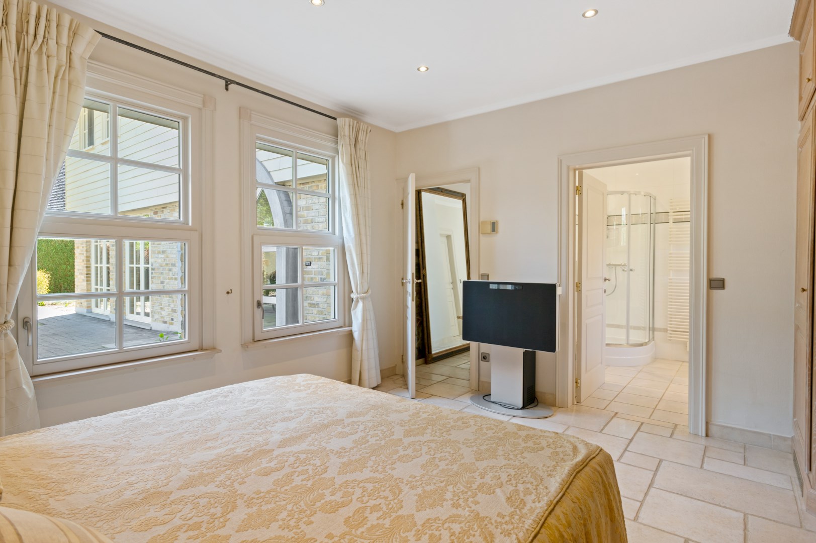 De stijlvolle trap brengt u tot de eerste verdieping waar de overloop op parketvloer toegang geeft tot, enerzijds de masterbedroom met aansluitend een ruime kamer ingericht als dressing. Centraal is er een stijlvol ingerichte badkamer met douche, badkamermeubel en toilet. Ten slotte zijn er nog 2 ruime slaapkamers, waarvan één met private badkamer met ligbad, badkamermeubel en toilet. Ten slotte is er nog een open bureau.