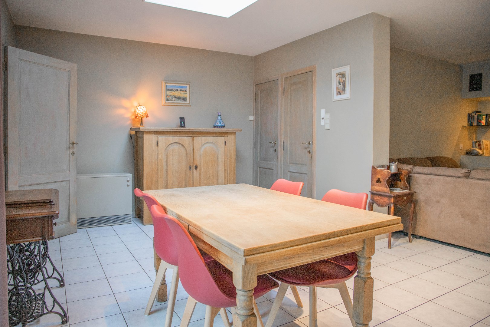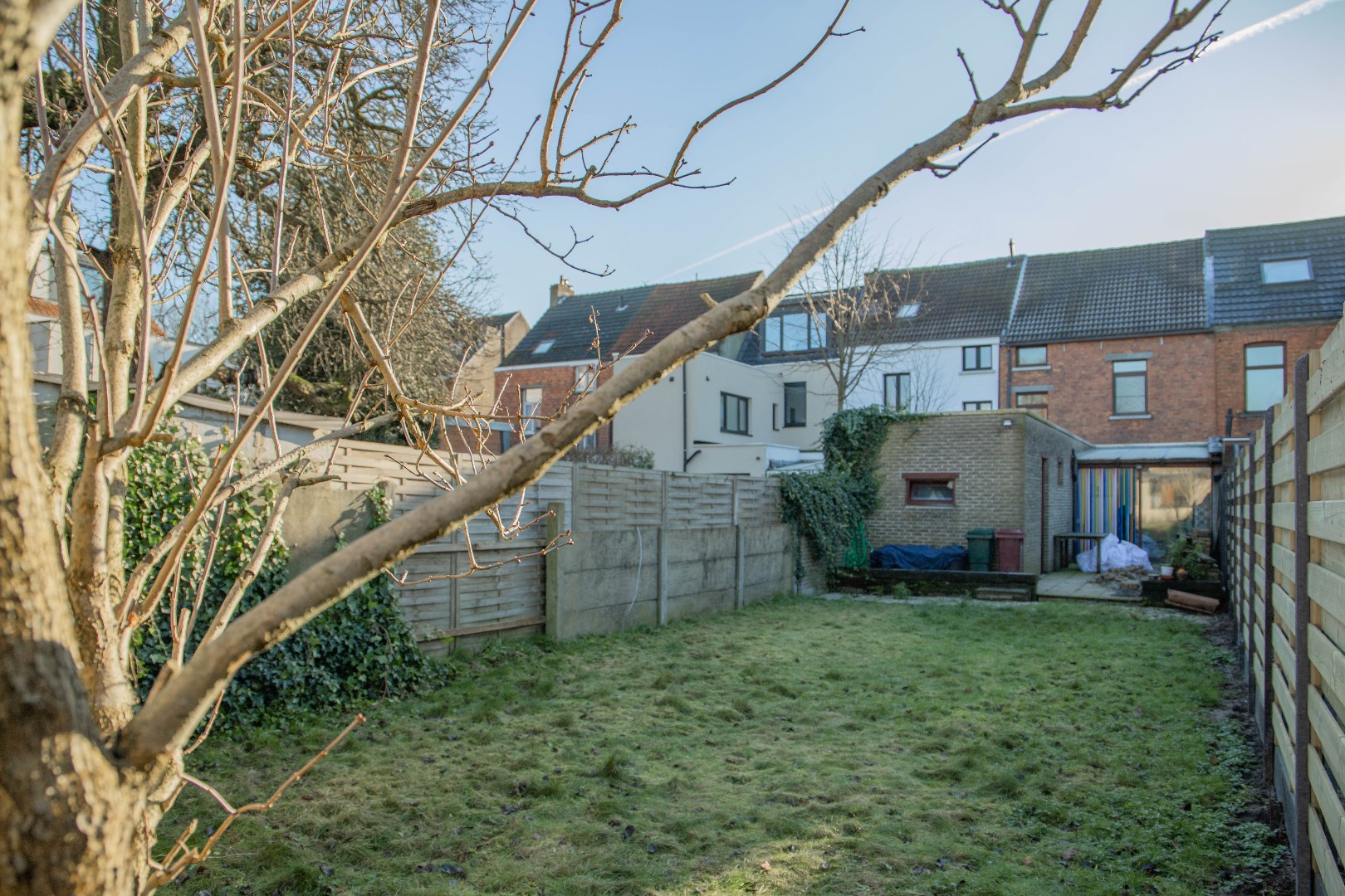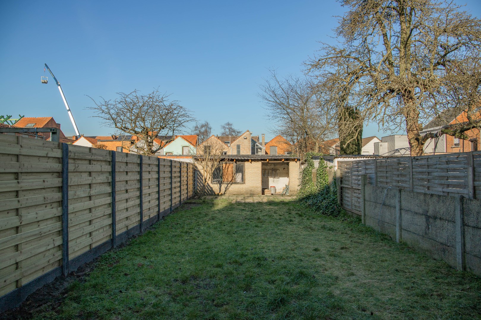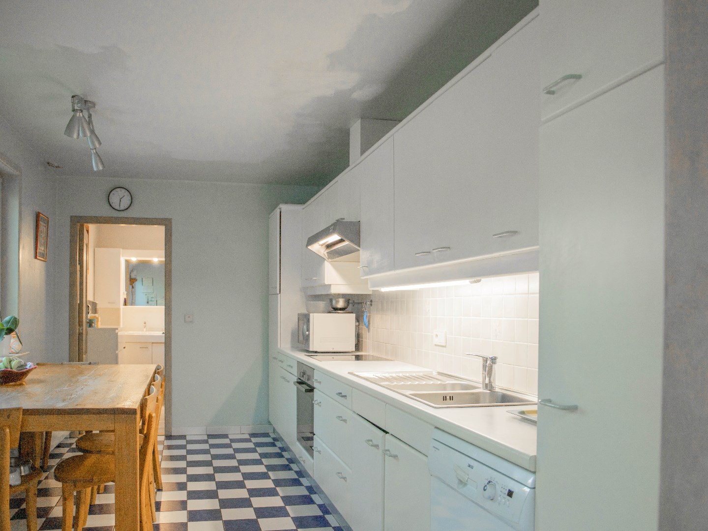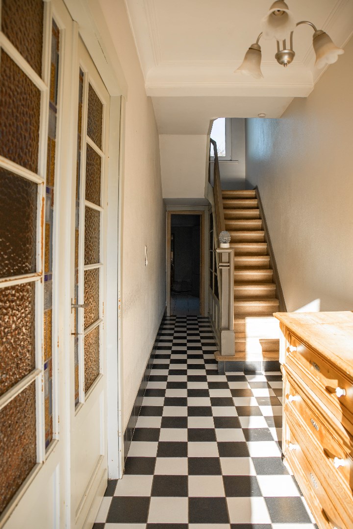 Via de inkomhal op mozaïekvloer komt u de woning binnen. De deuren met glas in lood springen hierbij direct in het oog en geven toegang tot de inpandige garage, die ruimte biedt voor een kleine wagen of fietsen. We gaan verder naar achter en komen zo in de ruime leefruimte. De ruime keuken – met voldoende kasten en toestellen – sluit hierbij mooi aan. Zowel vanuit de leefruimte als de keuken is er toegang tot de veranda. De badkamer is ingericht met een ligbad, lavabomeubel en toilet. Achter de badkamer is er een berging/wasplaats, enkel bereikbaar via de tuin.