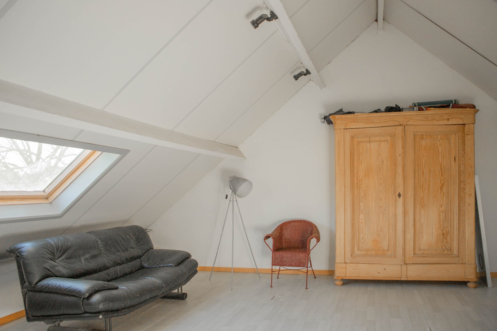 Met een vaste trap kunnen we tot bij de tweede verdieping, waar we een zeer ruime kamer hebben met plafondhoogte tot in de nok.
